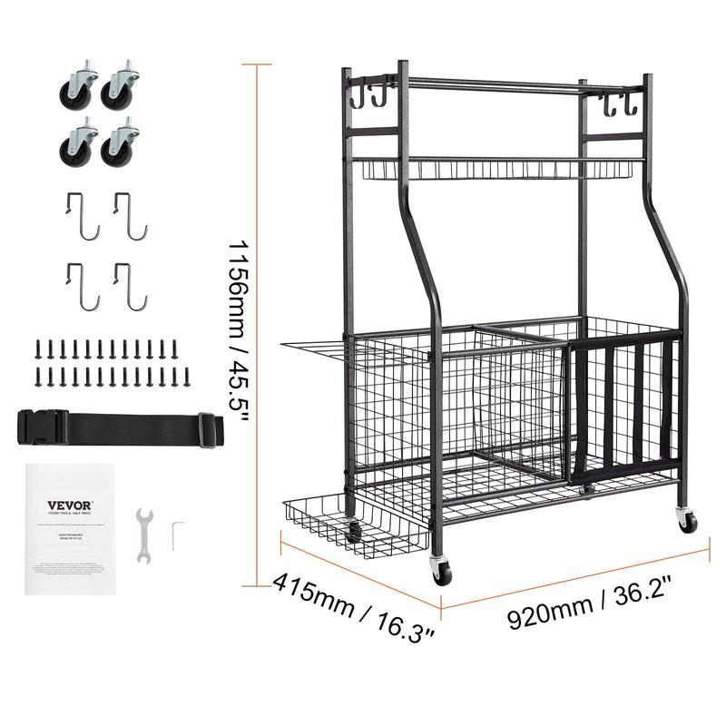 • Extra Large Capacity: This multifunctional sports storage comes equipped with 1 metal frame, 1 elastic band storage box, 1 long metal wire basket, 1 top double rod, and 1 side rack that can hold up to 12 clubs. All these storage accessories help to keep your sports equipment organized, ensuring your items are neatly arranged, truly saving space and offering convenient access.
