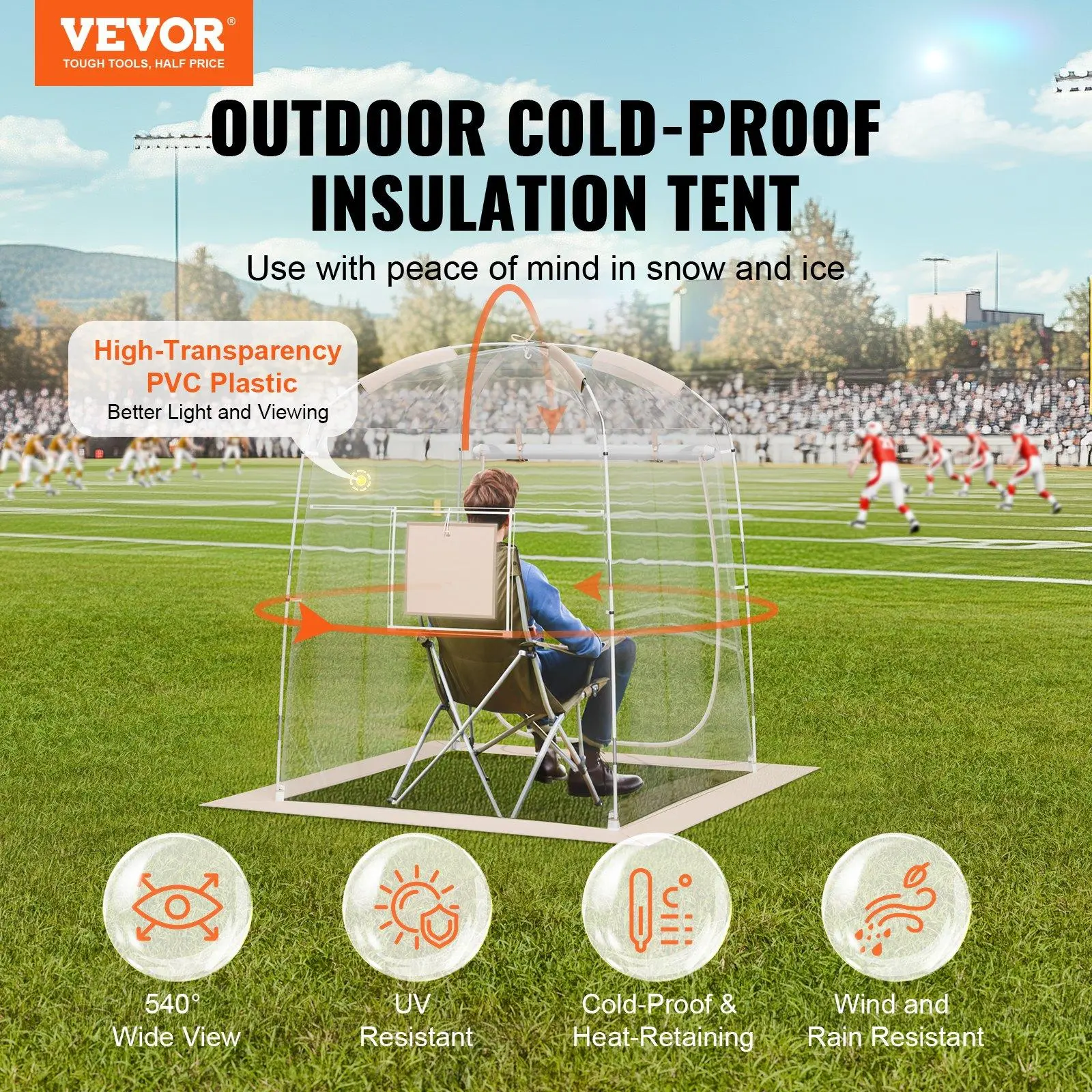 ·50" x 50" Waterproof & Cold-Resistant Tent: Our sports tent is made with cold-resistant PVC plastic, designed to keep you cozy while providing a crystal-clear view. Thanks to its tear-proof material and heat-sealed seams, no need to worry about leaks—even in snowy conditions. With a roomy four-sided design and a window, you'll have plenty of space to enjoy the outdoors.