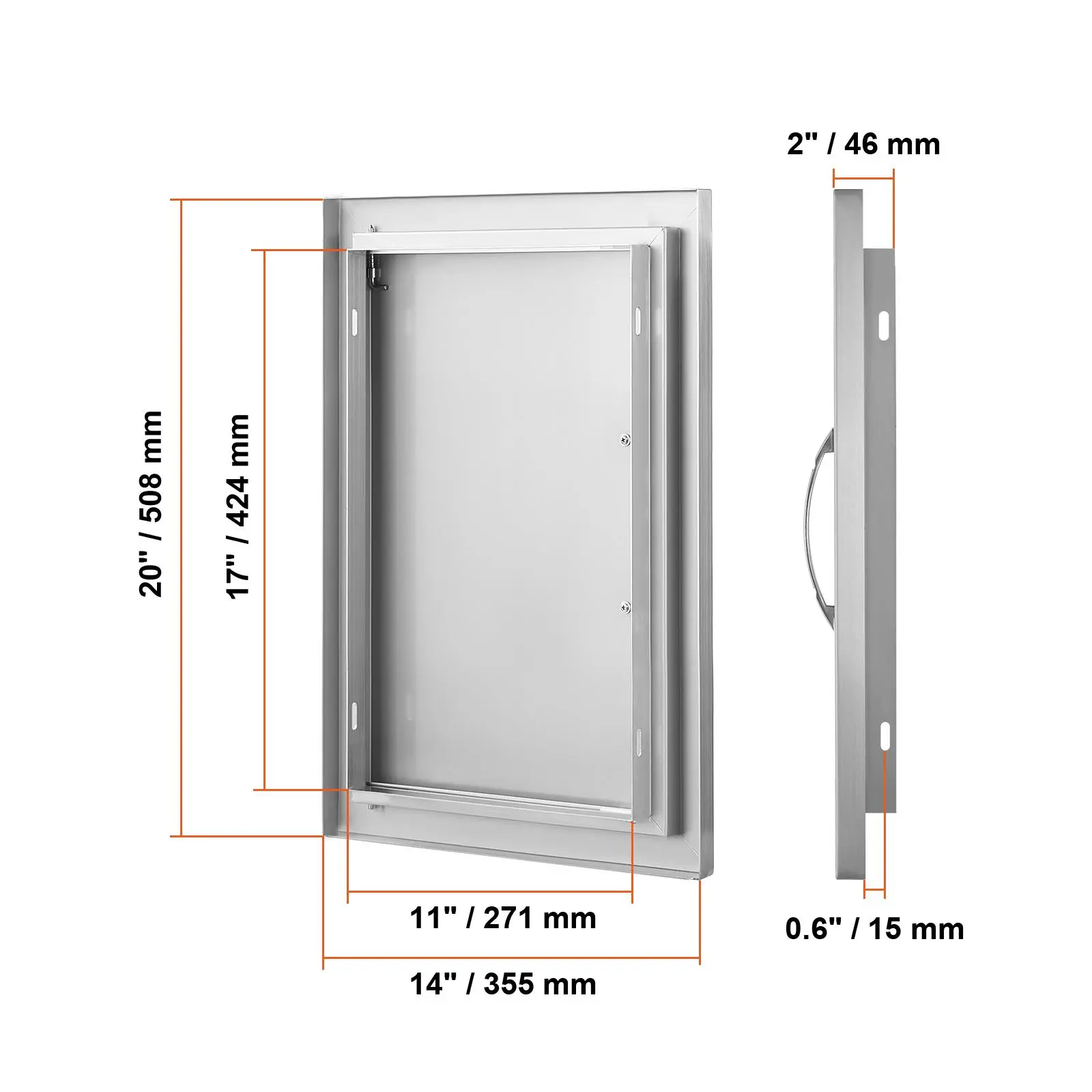 • Precision Opening: Overall dimensions: 355x508x46 mm / 14x20x2 inches, installation size: 11x17inch/271x424mm, it is recommended to reserve an additional 0.08inch/2mm on this basis for better operation. The door is designed specifically for outdoor kitchens and barbecue islands, adding an elegant touch to your cooking area. With precise dimensions, it is easy to process, install, or dismantle. Available in various sizes and styles, it is perfect for indoor/outdoor kitchens and all other outdoor weather conditions.