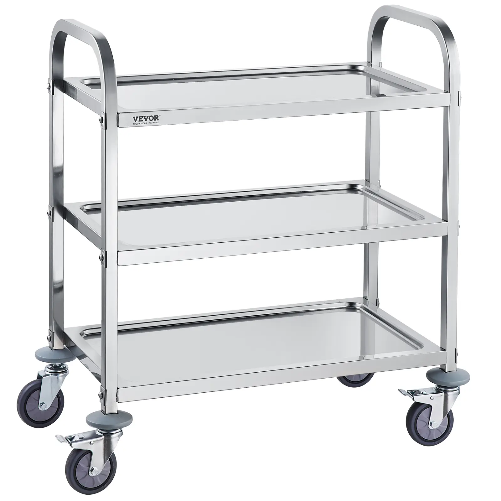 • 360° Silent Casters: Our stainless steel cart is equipped with four premium TPR swivel casters, allowing it to glide effortlessly and silently to any desired location, even when fully loaded. Additionally, two of the casters can be conveniently locked, providing enhanced stability and security, ensuring a secure position for your valuable items.