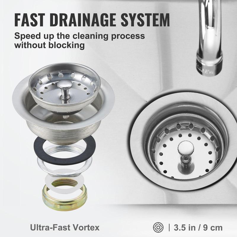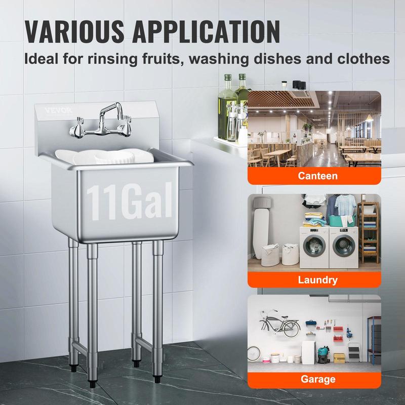 • Utility Sink for Commercial Use: This stainless prep sink is easy to assemble and includes all necessary accessories, with premium packaging. It is designed to efficiently accommodate fruits and vegetables, making washing more convenient. The sink suits various settings, such as commercial kitchens, laundry rooms, bars, restaurants, and garages. Tips: For your security, it is recommended to wear gloves during installation.
