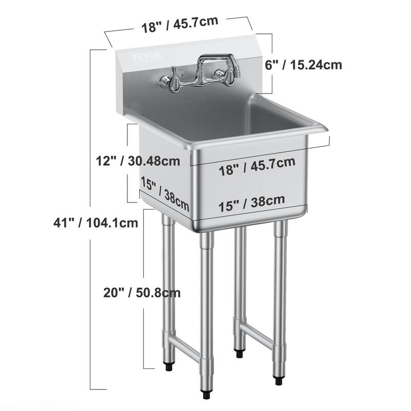• Robust & Durable Structure: This stainless steel utility sink with legs is designed to be extremely sturdy, with leg sleeves and adjustable levelers that safeguard your floor against scratches and ensure stability, even on uneven surfaces. The wall-mounted bracket provides an additional option for added stability.