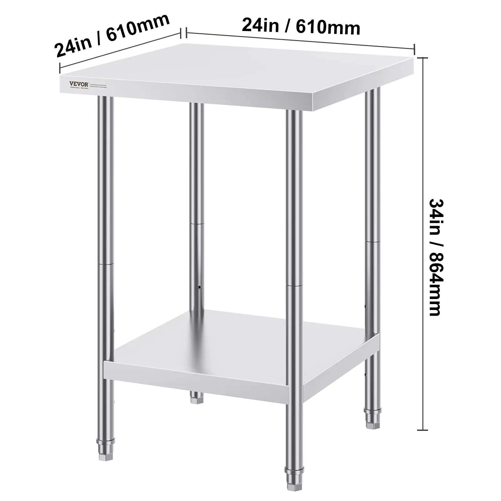 • High-Quality Stainless Steel: This work table, measuring 24 x 24 x 34 inch, is made from SUS201 stainless steel for the tabletop, shelves, and legs. It offers superior rust resistance, a sleek appearance, and a smooth surface that is easy to clean with a simple wipe. NSF certified, it meets strict public health standards, ensuring long-lasting protection for your health.