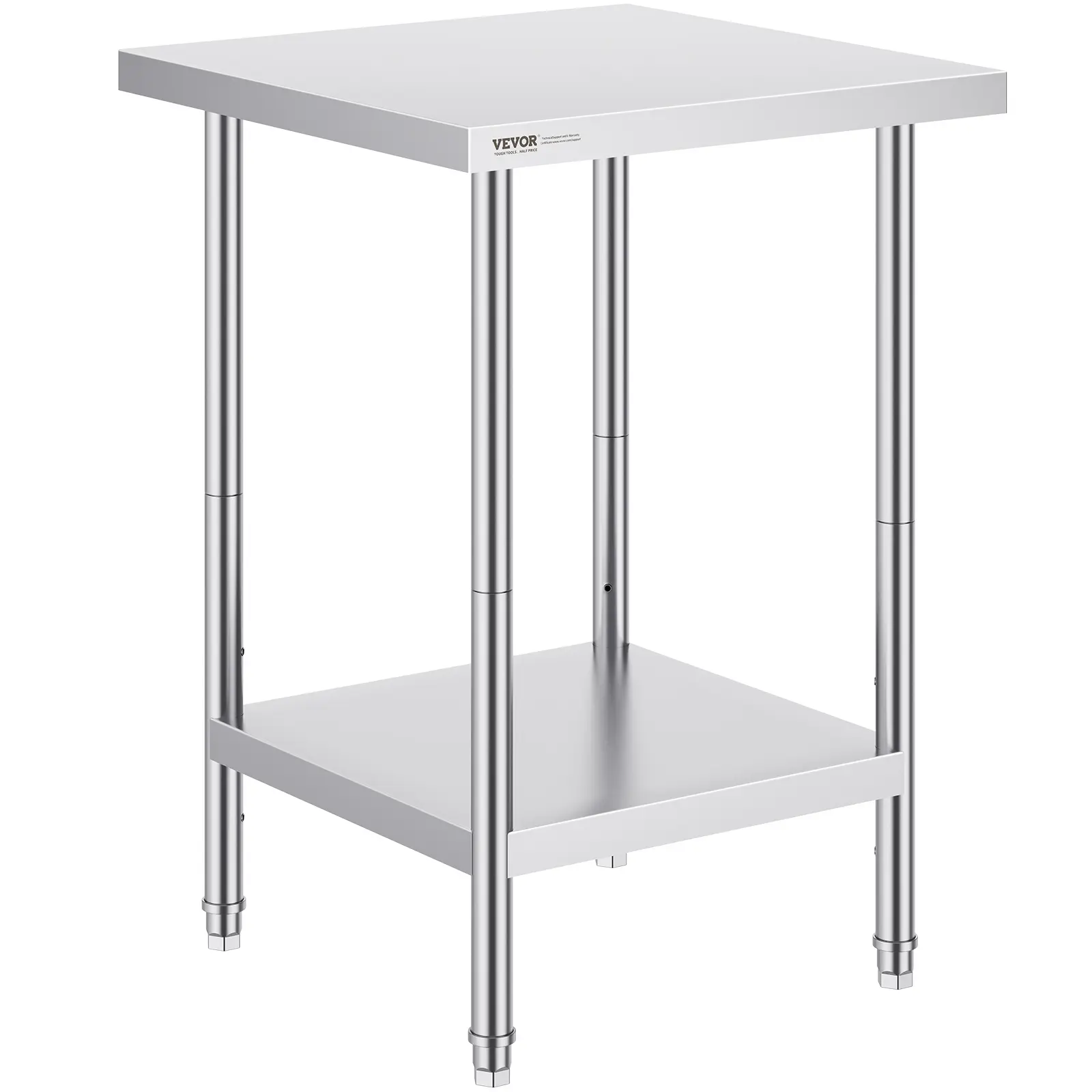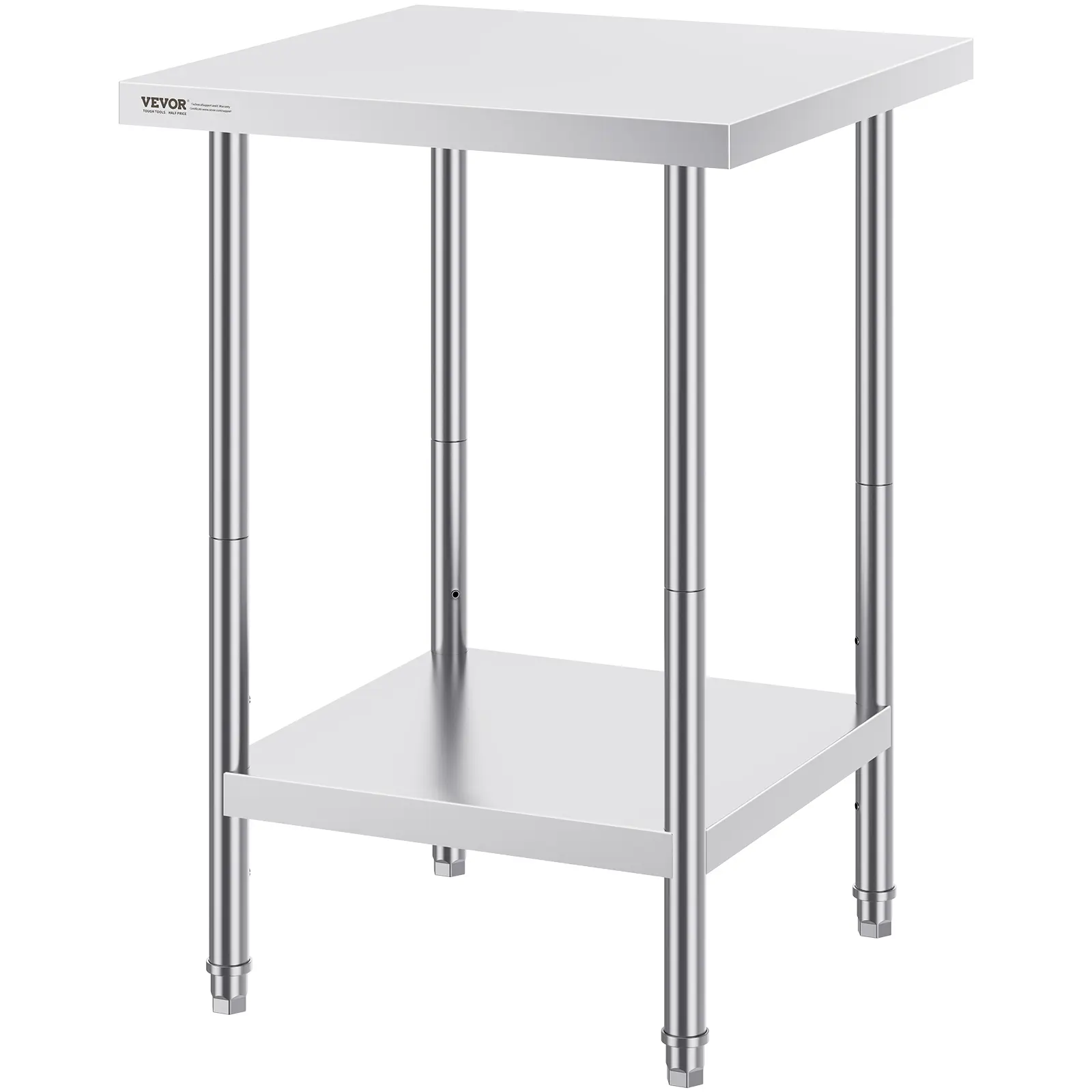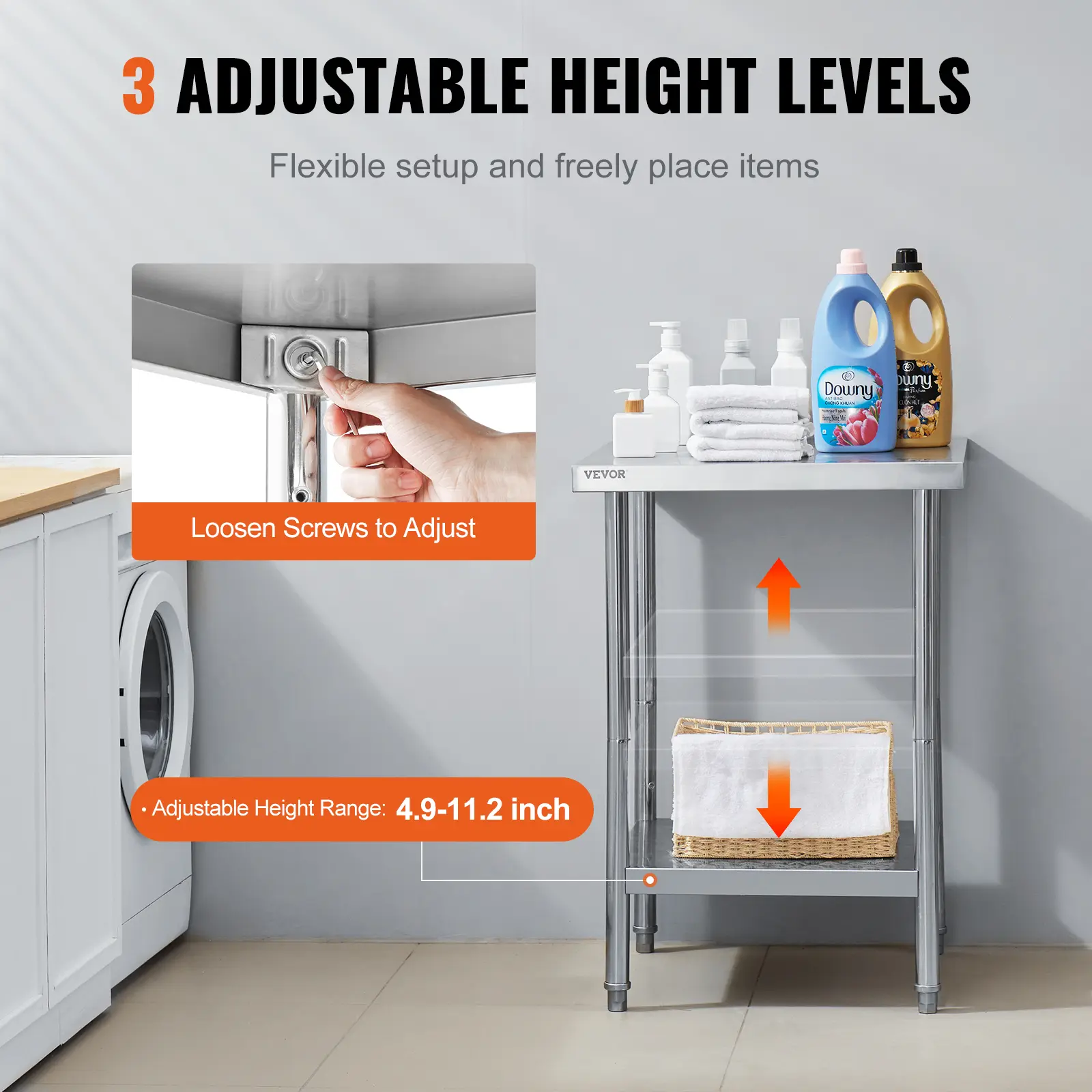 • High-Quality Stainless Steel: This work table, measuring 24 x 24 x 34 inch, is made from SUS201 stainless steel for the tabletop, shelves, and legs. It offers superior rust resistance, a sleek appearance, and a smooth surface that is easy to clean with a simple wipe. NSF certified, it meets strict public health standards, ensuring long-lasting protection for your health.