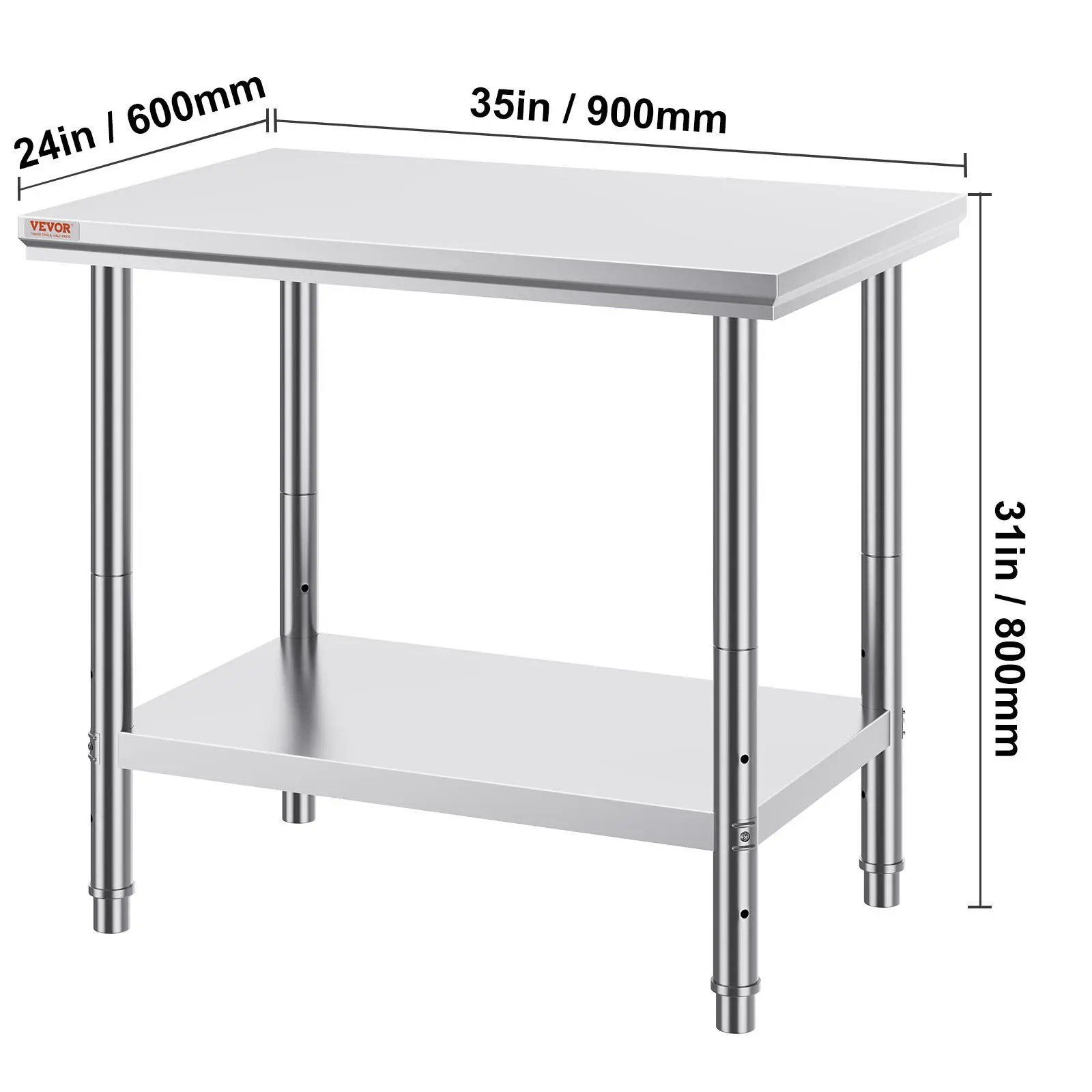 • High-Quality Stainless Steel: This work table, measuring 35 x 24 x 31 inch, is made from SUS201 stainless steel for the tabletop, shelves, and legs. It offers superior rust resistance, a sleek appearance, and a smooth surface that is easy to clean with a simple wipe. NSF certified, it meets strict public health standards, ensuring long-lasting protection for your health.