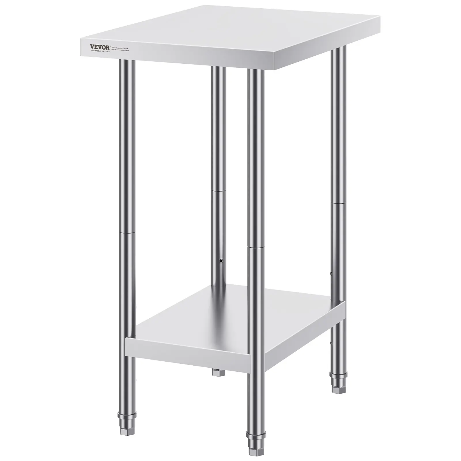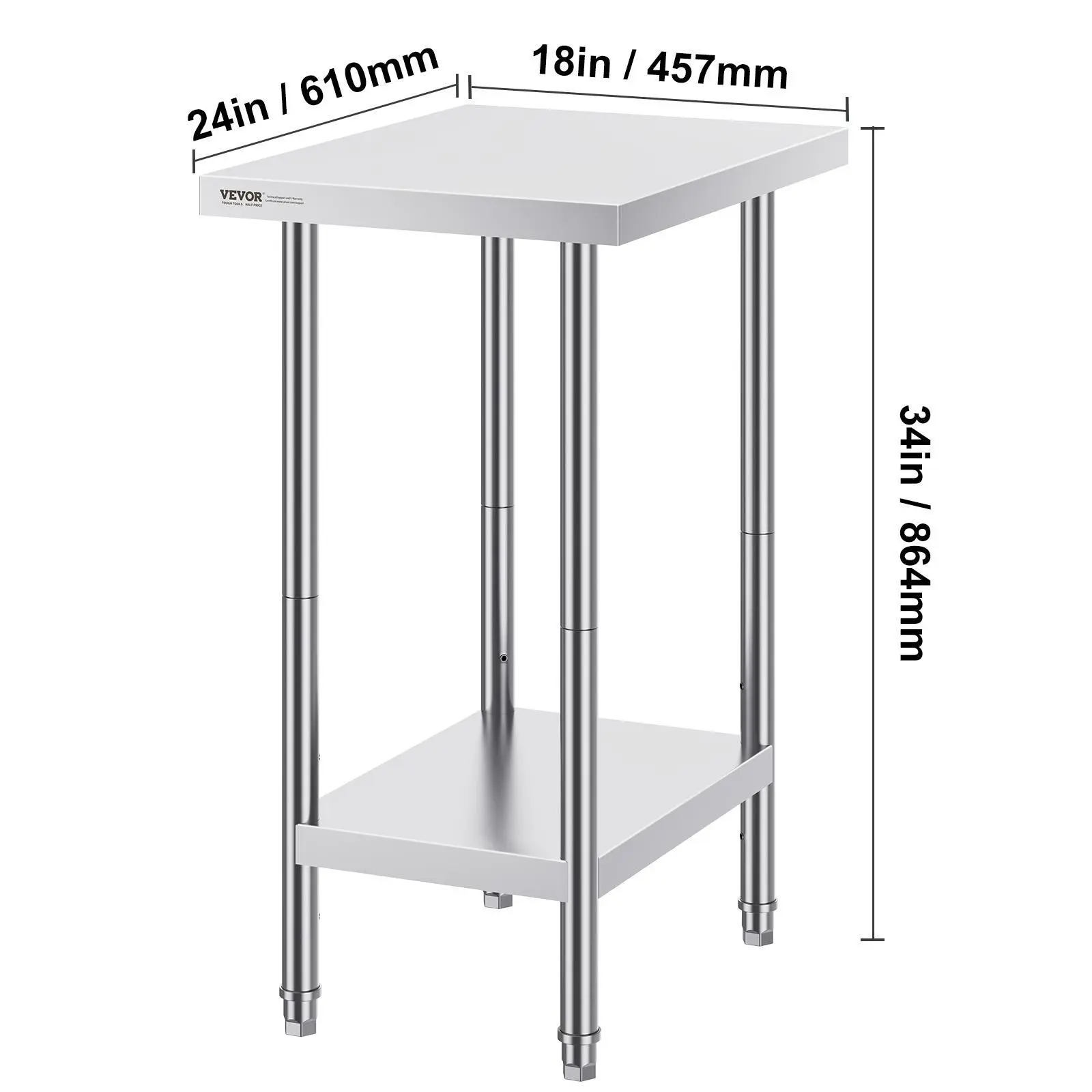 • High-Quality Stainless Steel: This work table, measuring 24 x 18 x 34 inch, is made from SUS201 stainless steel for the tabletop, shelves, and legs. It offers superior rust resistance, a sleek appearance, and a smooth surface that is easy to clean with a simple wipe. NSF certified, it meets strict public health standards, ensuring long-lasting protection for your health.