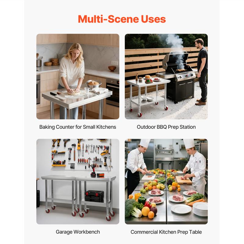 • Practical Sizes: Available in multiple sizes to fit your space. Our stainless steel table is ideal for kitchens, garages, or home renovations. Measure your area before purchase for a seamless fit