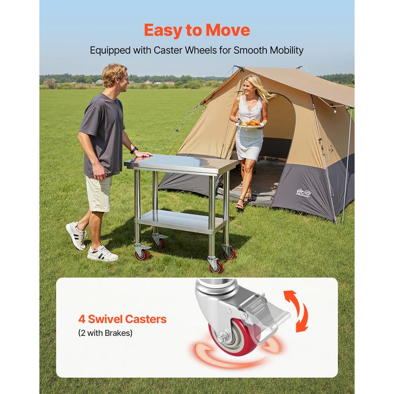 • Stable and Durable: The top shelf holds up to 400 lbs, the bottom 300 lbs, providing ample storage for your supplies. With 4 swivel casters (2 with brakes), the food prep worktable stays stable and moves easily wherever you need it