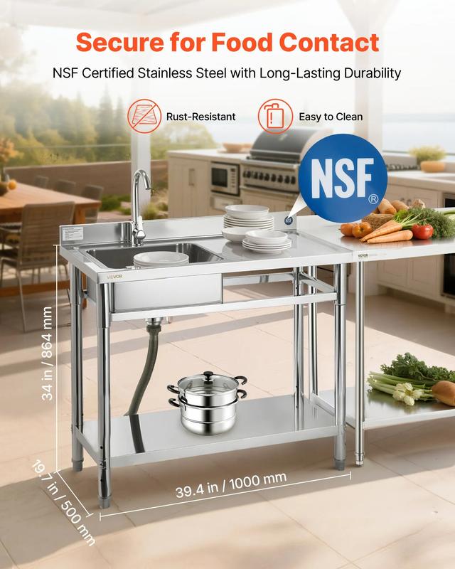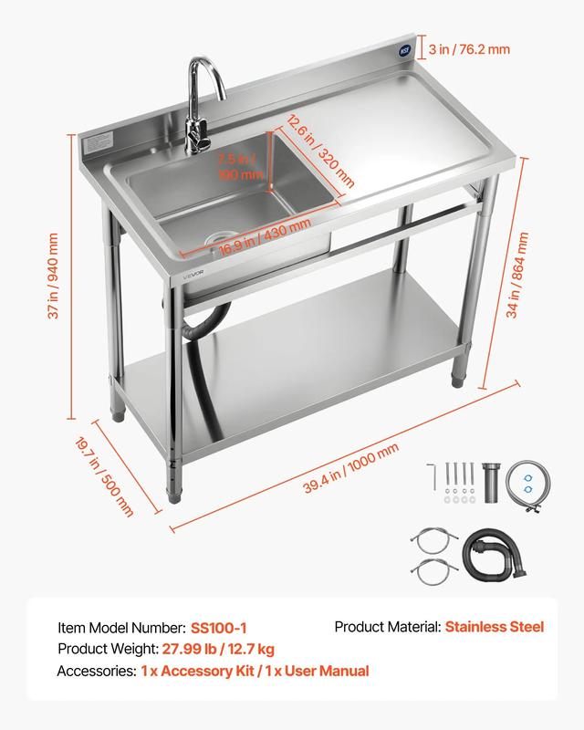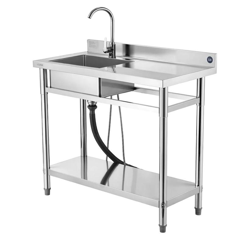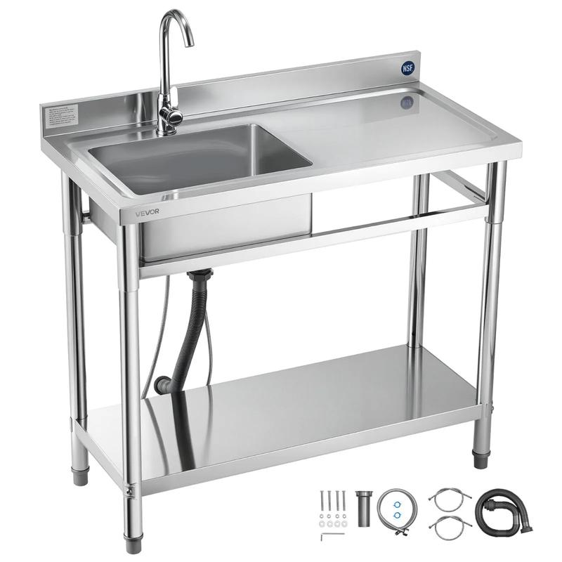 5. VEVOR Stainless Steel Utility Sink, Free Standing Single Bowl Commercial Kitchen Sink with Faucet, 39.4 x 19.7 x 37 in, Utility Right Basin with Hot & Cold Water Pipe for Garage, Restaurant, Laundry