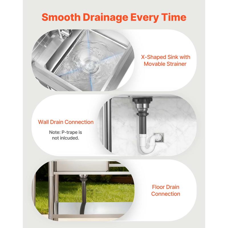 • Anti-Clog Drainage System: Multi-layer sealed drain with removable strainer basket avoids food residue from clogging pipes. This stainless utility sink includes both short pipe and long hose to adapt to different drain needs