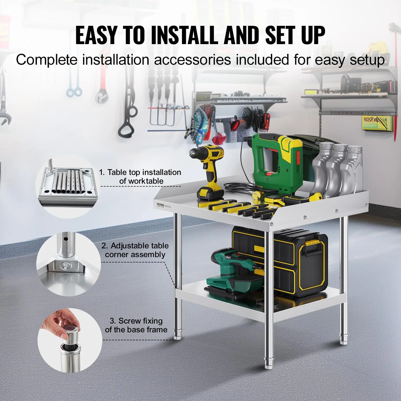 • User-Friendly Design: Featuring 3-level adjustable shelves, this work table offers the most user-friendly and practical functionality. Simply adjust the shelf height with screws to accommodate items of different sizes. The 2-inch edge backsplash prevents valuable equipment and supplies from sliding off the table and also protects against water splashes.