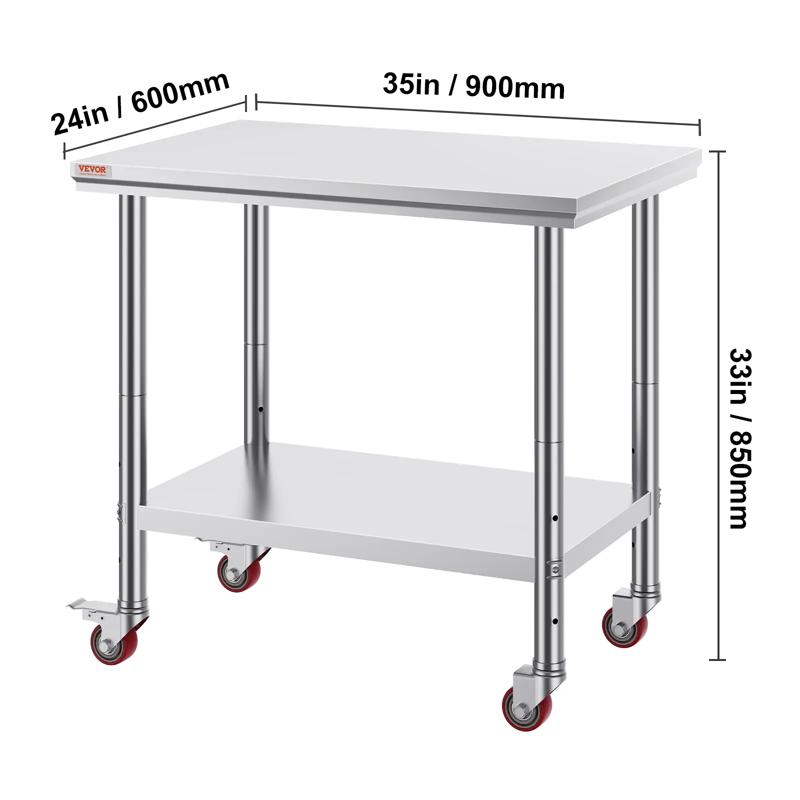 • High-Quality Stainless Steel: This work table, measuring 35 x 24 x 33 inch, is made from SUS201 stainless steel for the tabletop, shelves, and legs. It offers superior rust resistance, a sleek appearance, and a smooth surface that is easy to clean with a simple wipe. NSF certified, it meets strict public health standards, ensuring long-lasting protection for your health.