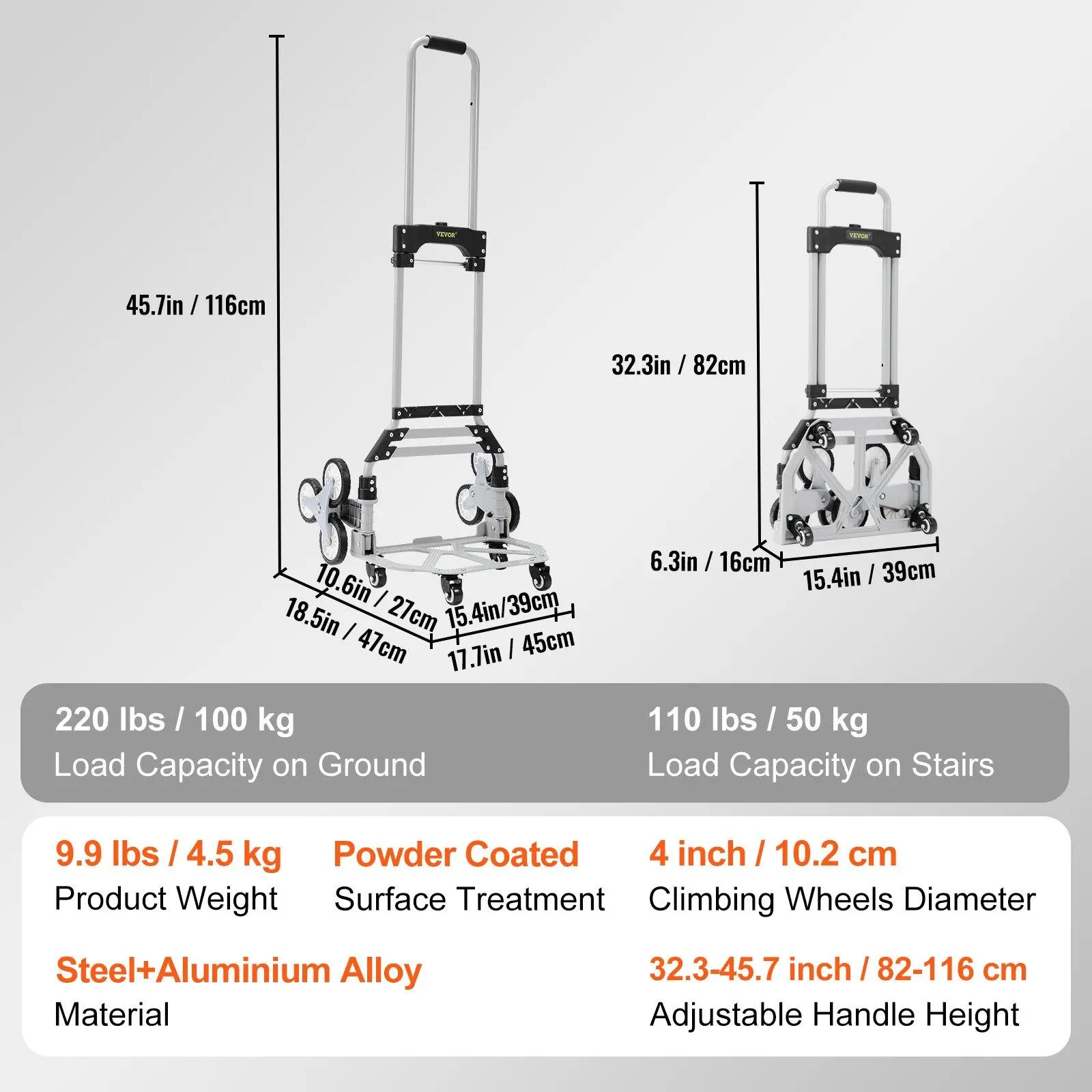 Transport your luggage on stairs or various surfaces effortlessly with this VEVOR stair-climbing cart. Featuring high-quality materials, it can load up to 220 lbs on the ground and 110 lbs when climbing.