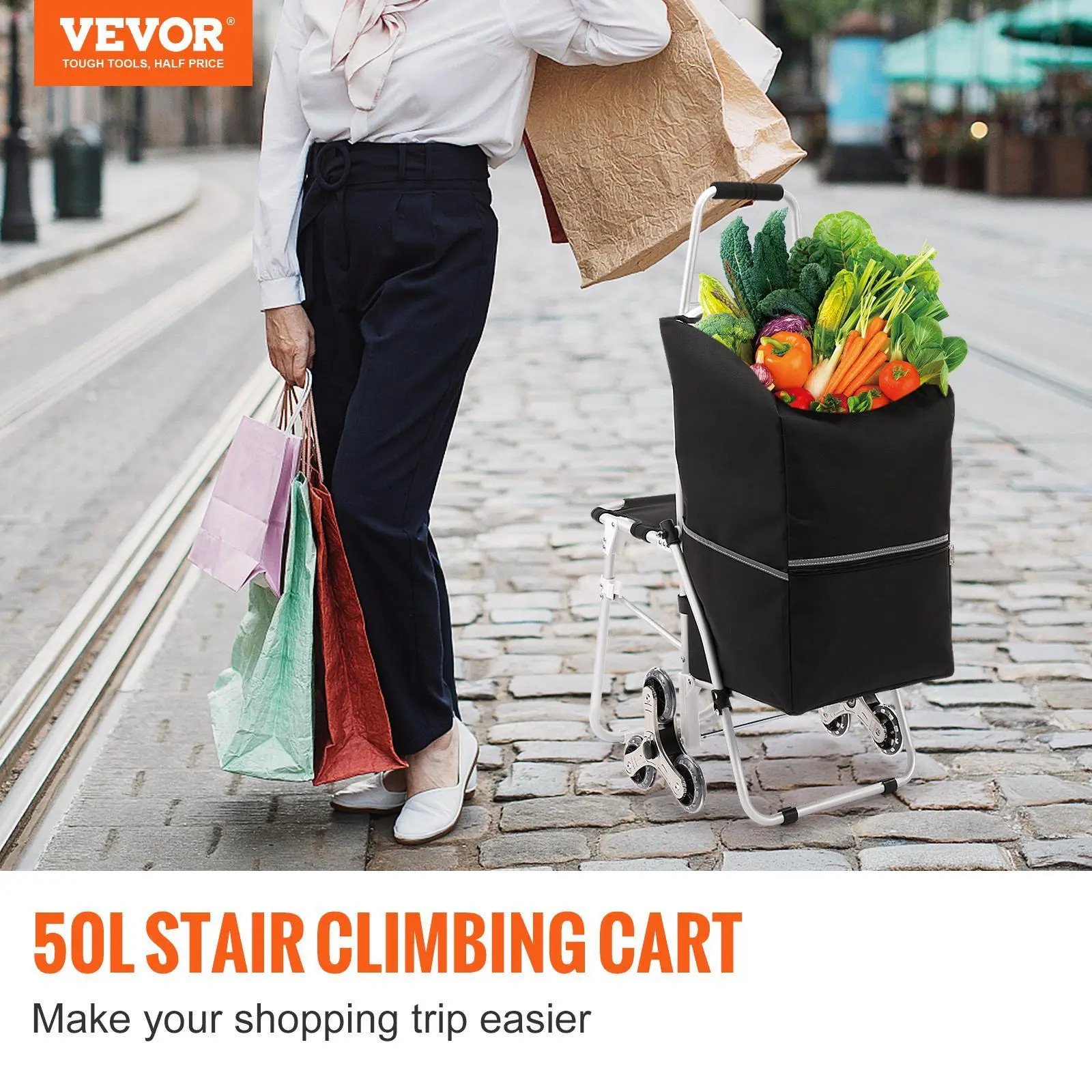 • Large Capacity & Strong Loading: Our grocery cart includes a 50L waterproof bag made of 600D Oxford cloth, giving you enough space to store laundry items, fruit, food, documents, tools, and more. In addition, the integrated aluminum alloy frame can withstand the heavy weight of your luggage. It can carry 165 lbs when static, 77 lbs when moving on the ground, and 33 lbs when climbing, meeting most household needs.