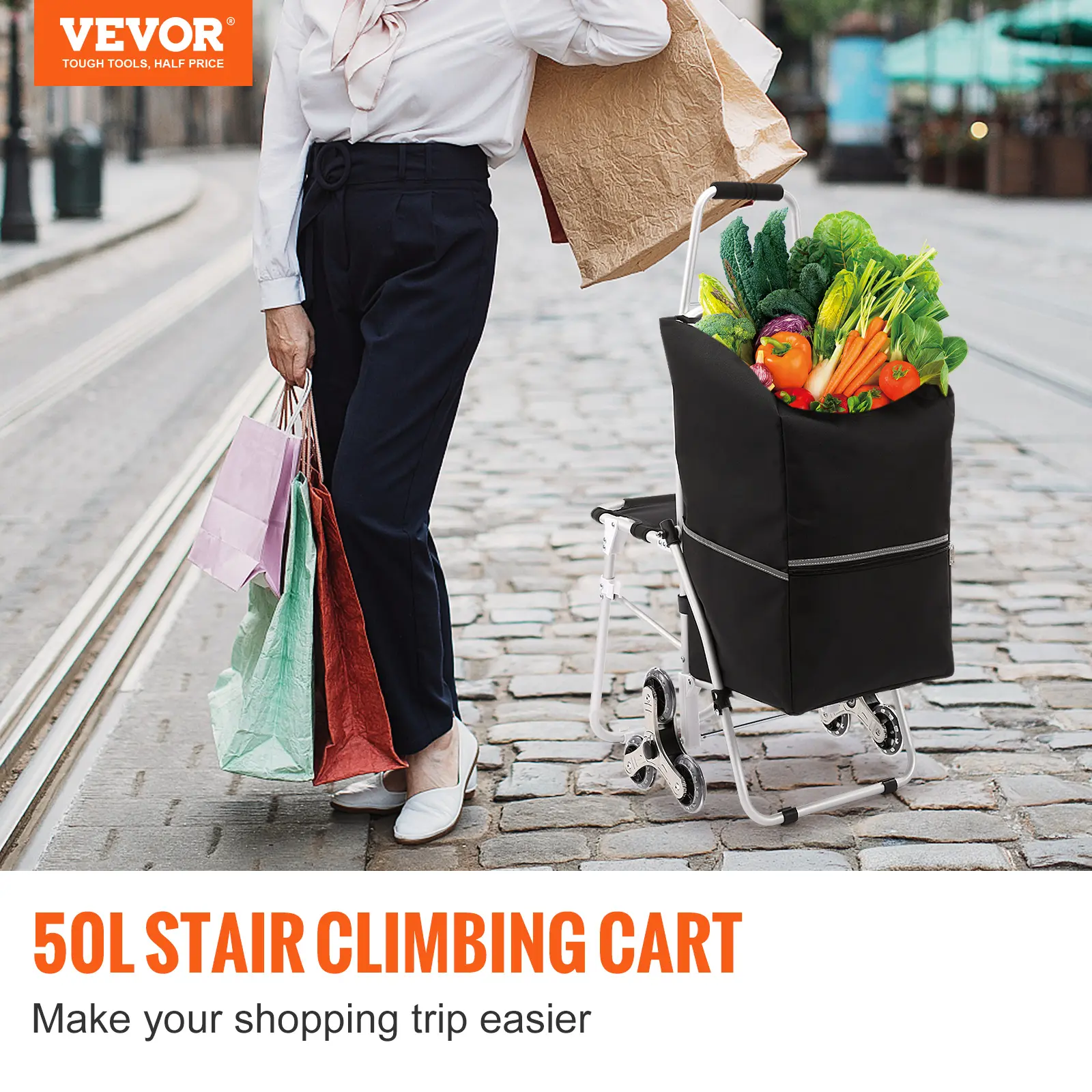 • Large Capacity & Strong Loading: Our grocery cart includes a 50L waterproof bag made of 600D Oxford cloth, giving you enough space to store laundry items, fruit, food, documents, tools, and more. In addition, the integrated aluminum alloy frame can withstand the heavy weight of your luggage. It can carry 165 lbs when static, 77 lbs when moving on the ground, and 33 lbs when climbing, meeting most household needs.