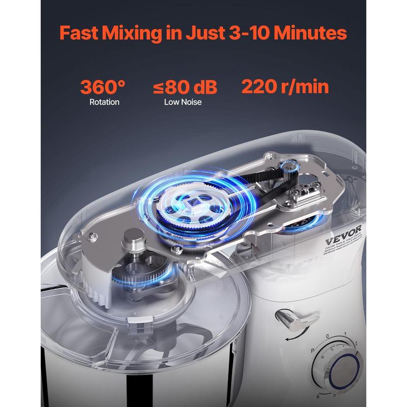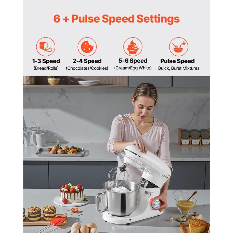 • High-performance Mixing: Our electric food mixer comes with a powerful motor and a worm gear drive for quick and uniform mixing. Choose from 6 adjustable speeds and a pulse setting to get your desired result every time. Use speeds 1-3 for dough, 2-4 for fillings, and 5-6 for whipping cream. Note: Always stop the machine before changing speed.