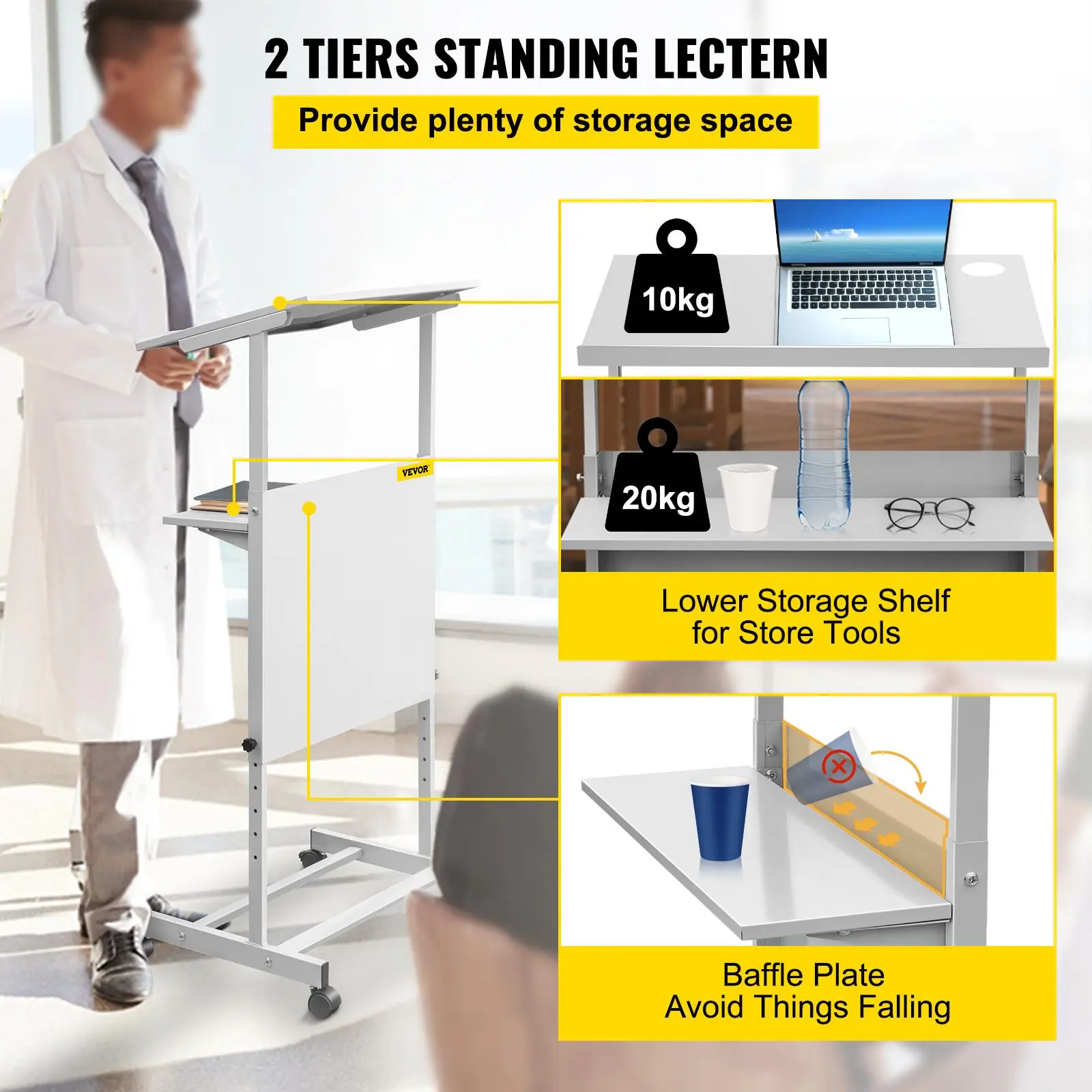 • 2 Tiers Layer Design: The lectern podium stand has a lower storage shelf which provides plenty of storage space to store your tools. The weight capacity of desktop board is 22 lbs / 10 kg, small board is 44 lbs / 20 kg. You can make full use of its space. Besides, the baffle plate keeps your stuff from falling.
