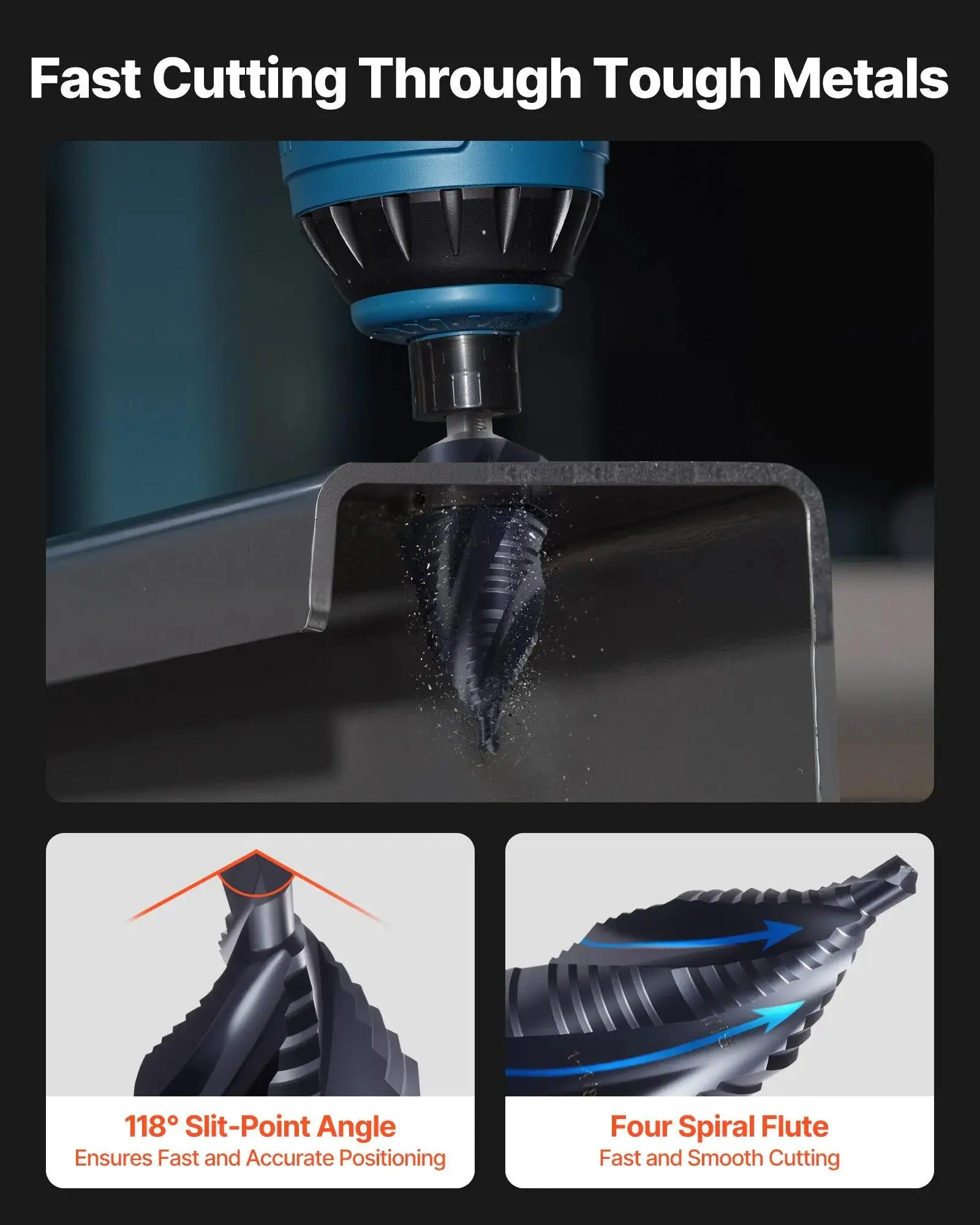 ·Optimized Cutting Angle: Our step drill bit for metal features a 118° tip and four-flute design, ensuring fast chip clearing, less heat buildup, and clean, burr-free holes in wood, plastic, and fiberglass