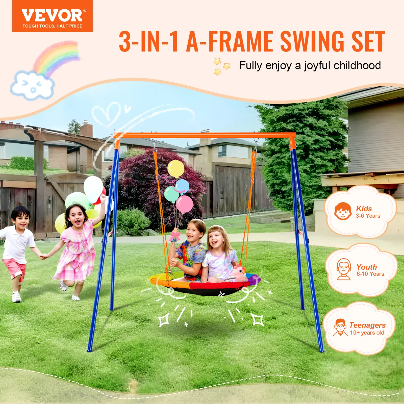 • Premium Seat: Our swing sets for backyard come with a high-quality Oxford fabric seat, known for durability and colorfastness. They are resistant to wear and tear even after prolonged use. Adjustable high-quality PE ropes are sun-resistant and do not fade over the years.