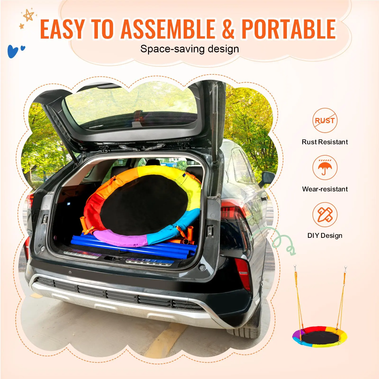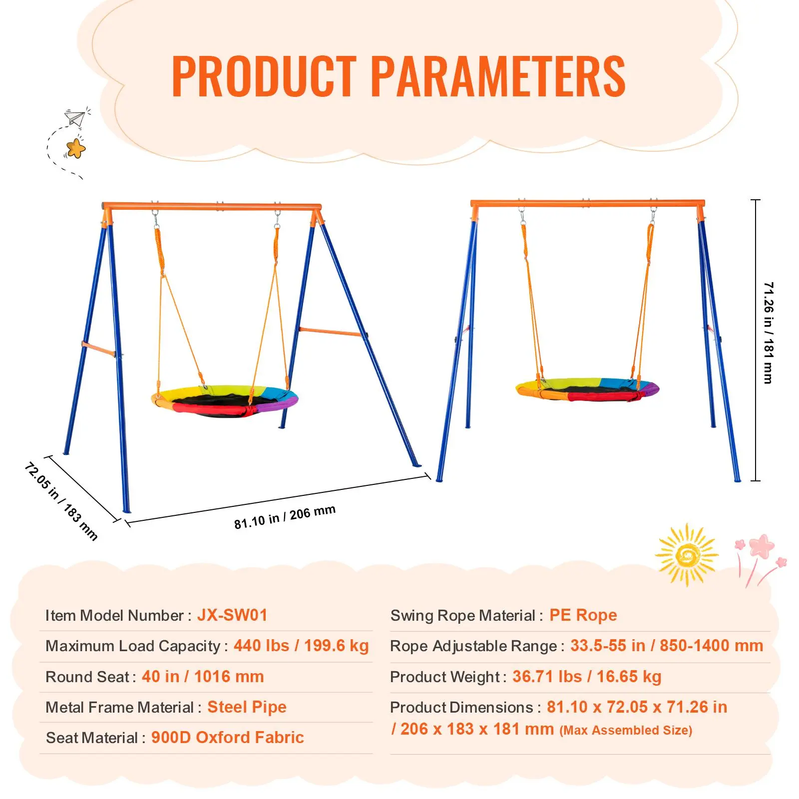 • Premium Seat: Our swing sets for backyard come with a high-quality Oxford fabric seat, known for durability and colorfastness. They are resistant to wear and tear even after prolonged use. Adjustable high-quality PE ropes are sun-resistant and do not fade over the years.