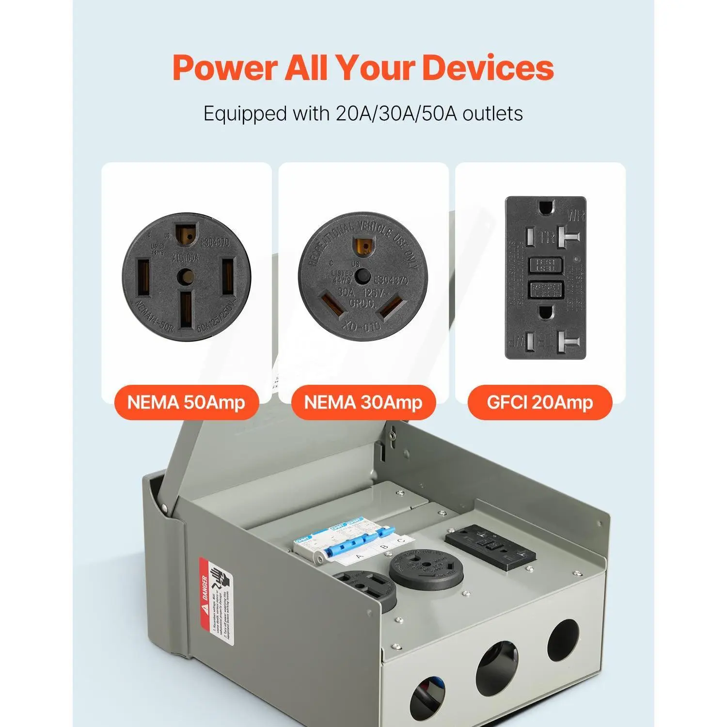 • High Compatibility for Every Device: With options for NEMA 50 Amp, NEMA 30 Amp, and GFCI 20 Amp outlets, our RV electrical outlet panel accommodates all your power needs. Enjoy generous wiring space that allows you to choose the right outlet for your cables—making your setup as easy as plug-and-play!