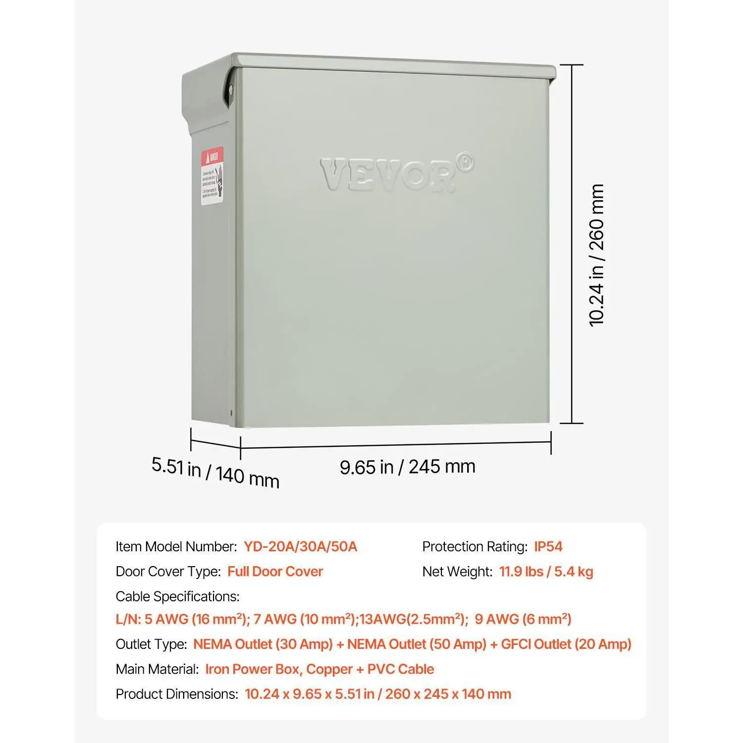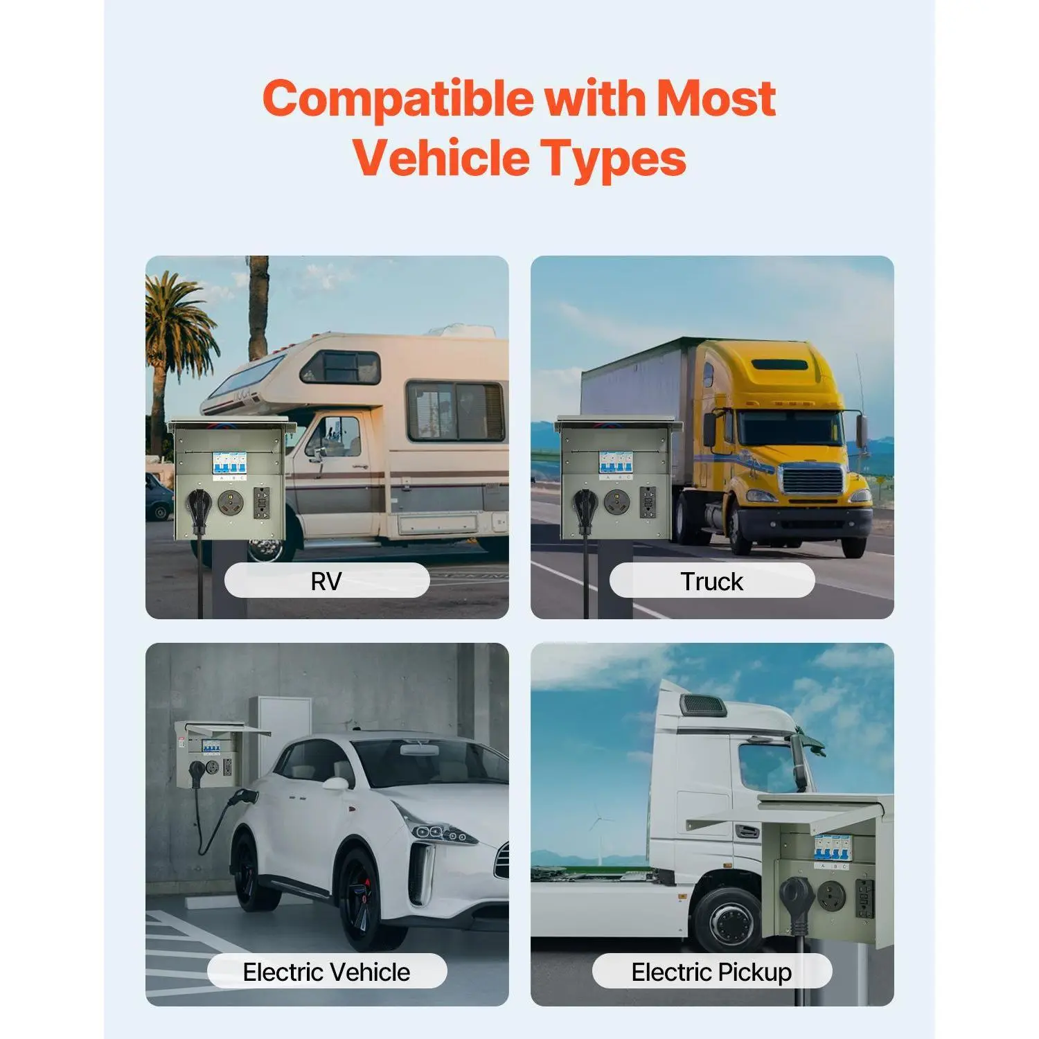 • IP54 Waterproofing, Security First: Don’t let rain dampen your plans! Our RV EV receptacle panel features an IP54 waterproof rating and WR (Weather-Resistant) outlets that automatically disconnect when in contact with water.
