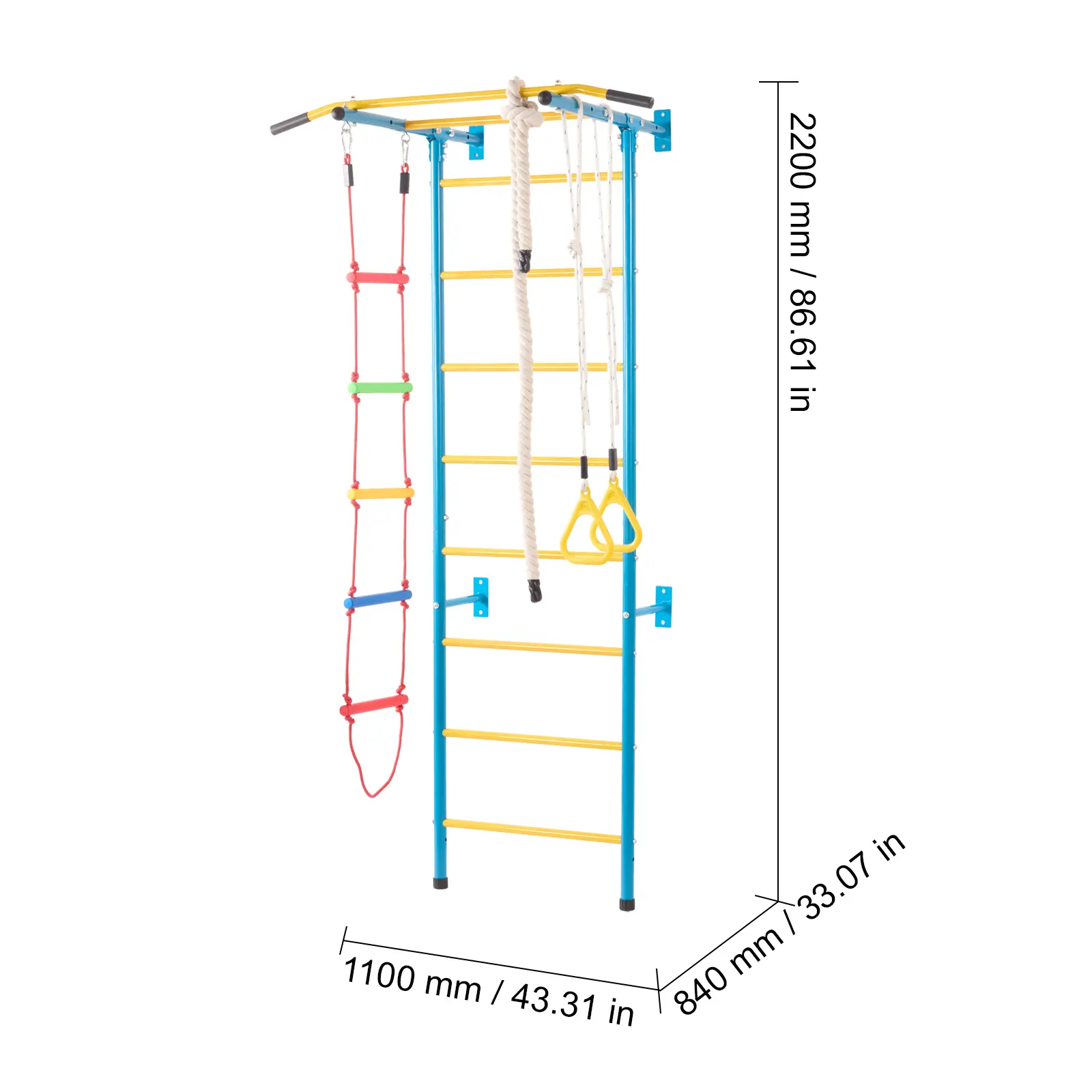 • Our wall gym for kids combines a pull-up bar, gym rings, rope ladder, and other play activities. It helps children exercise, improve coordination, and have fun. Perfect for young adventurers!
