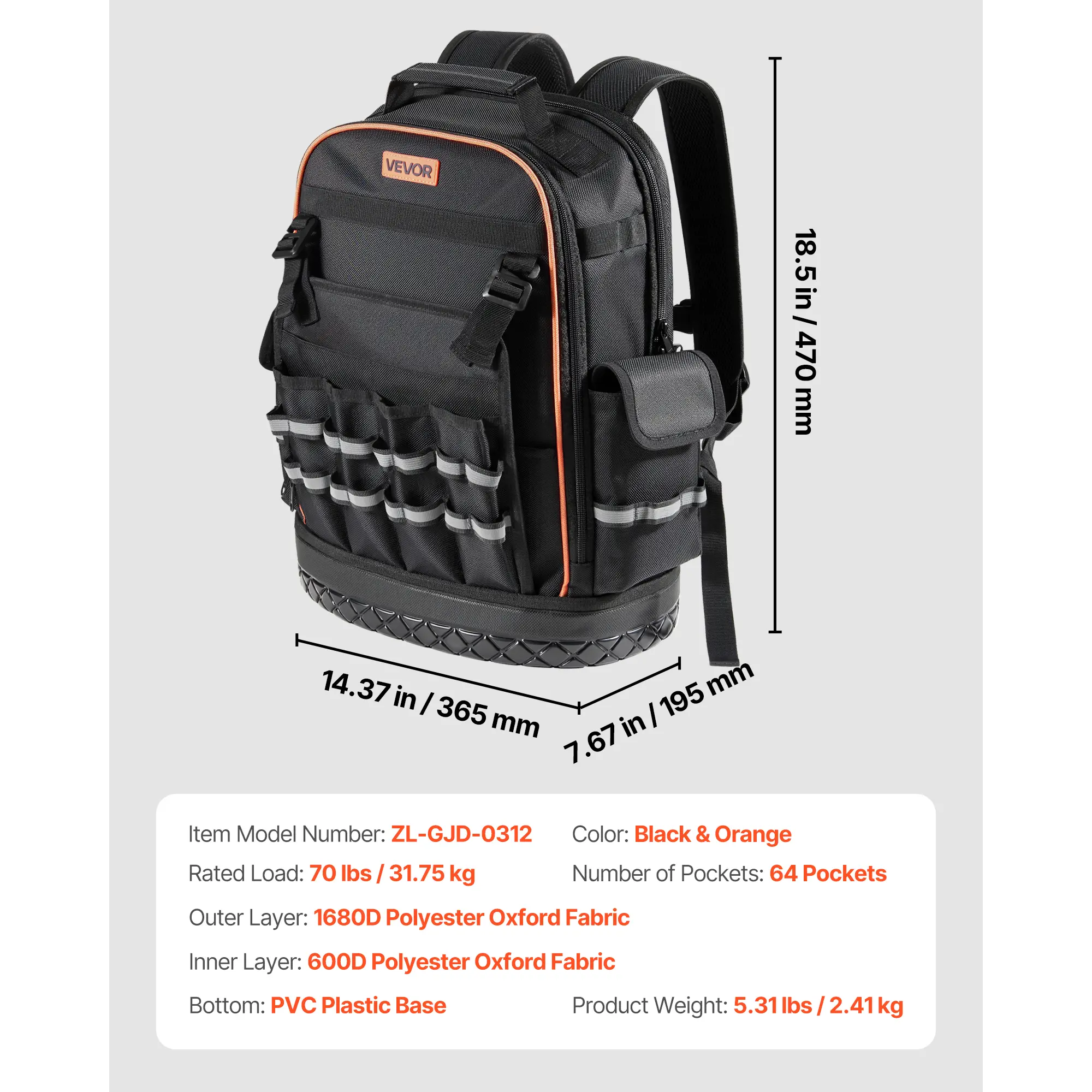• 64 Pockets for Organization: This tool backpack (14.37 x 7.67 x 18.5 inches) holds up to 70 lbs with 64 pockets, including a removable divider. Perfect for wrenches, drills, and more! It also features a laptop compartment and a transparent pouch for secure gear storage.