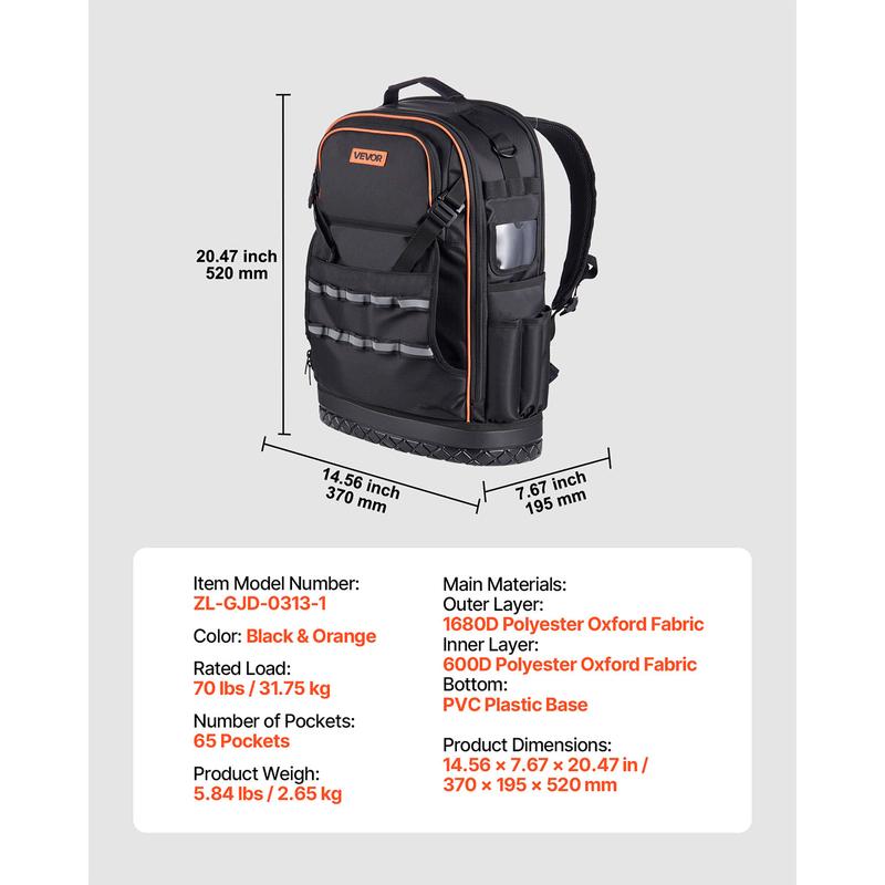 • 65 Pockets for Organization: This tool backpack (14.56 x 7.67 x 20.47 inches) holds up to 70 lbs and features 65 pockets, including a removable divider. Ideal for wrenches, drills, and more! Plus, it has a laptop compartment and transparent pouch to keep your gear secure from damage or loss