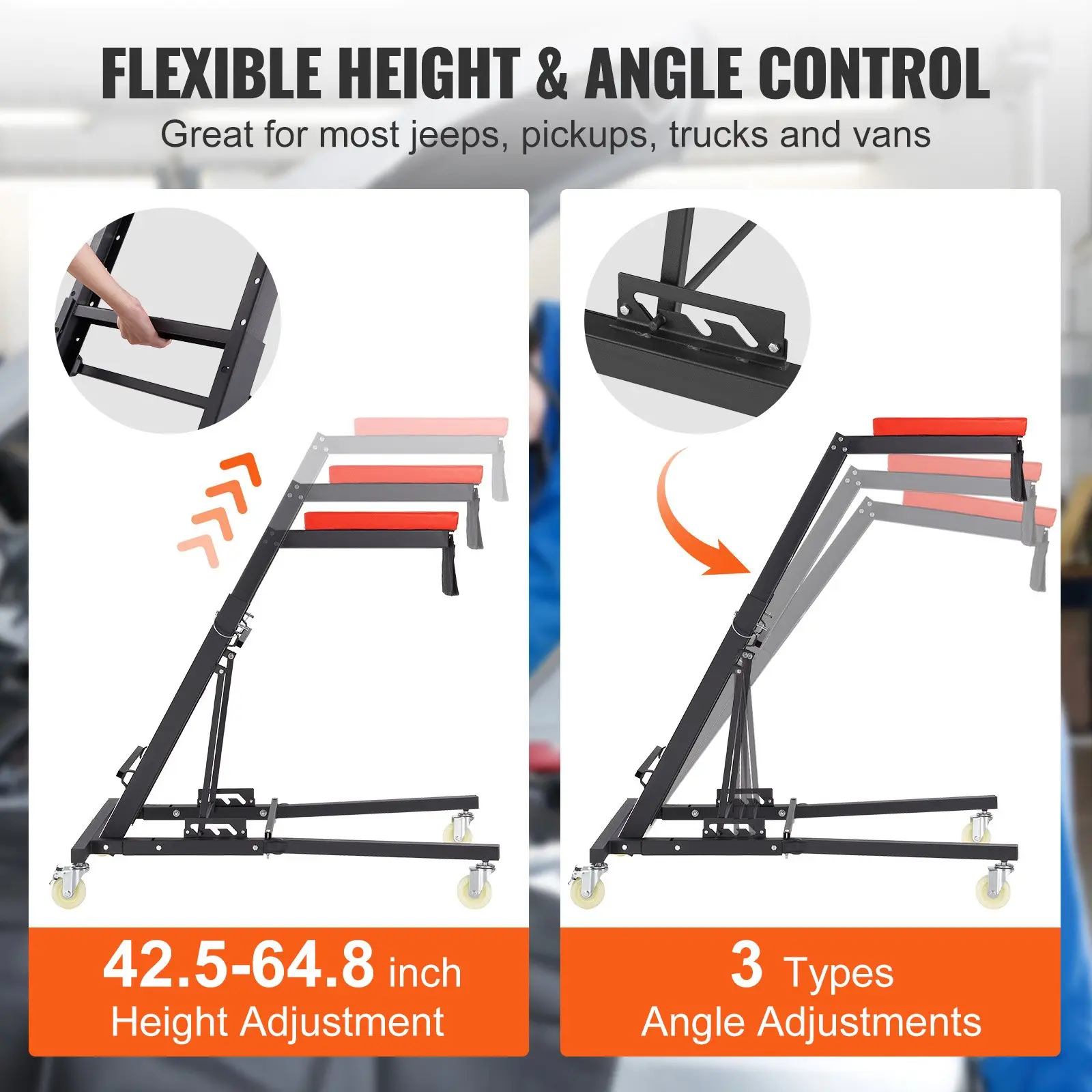 ·Flexible Height Adjustments: With a 9-stage height adjustment ranging from 42.5 to 64.8 inches (1080-1645 mm) and 3-angle options, our automotive topside creeper allows you to work comfortably without straining your body or overstretching your arms. Perfect for engine bay repairs on vehicles like jeeps, trucks, pickups, and more.