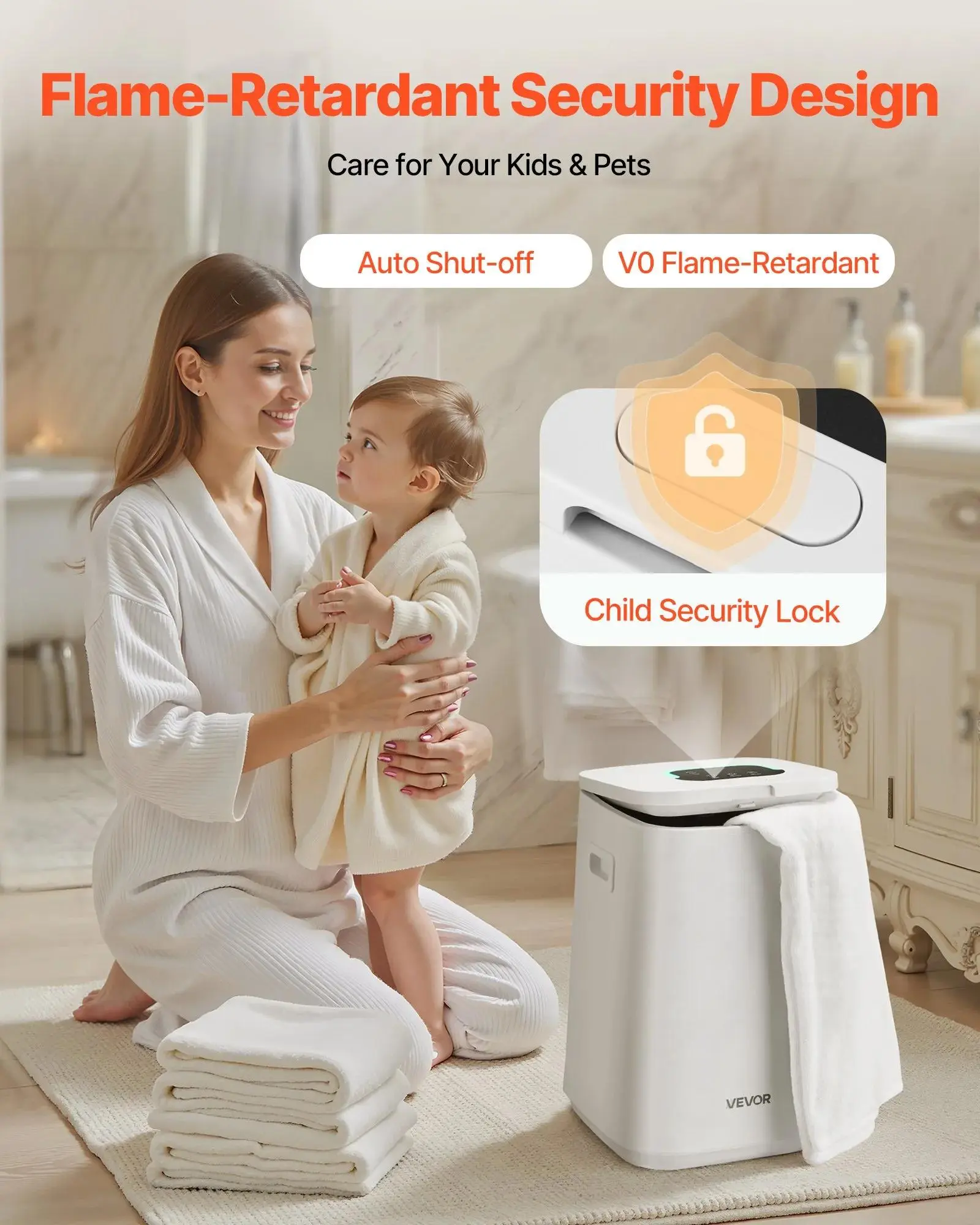 ·Child Lock & Overheat Alert: This towel warmer features a child lock and a U-shaped overheat light (red when over 60°C/140°F). It ensures safety by preventing little ones from touching hot surfaces. Keep your home safe and cozy!