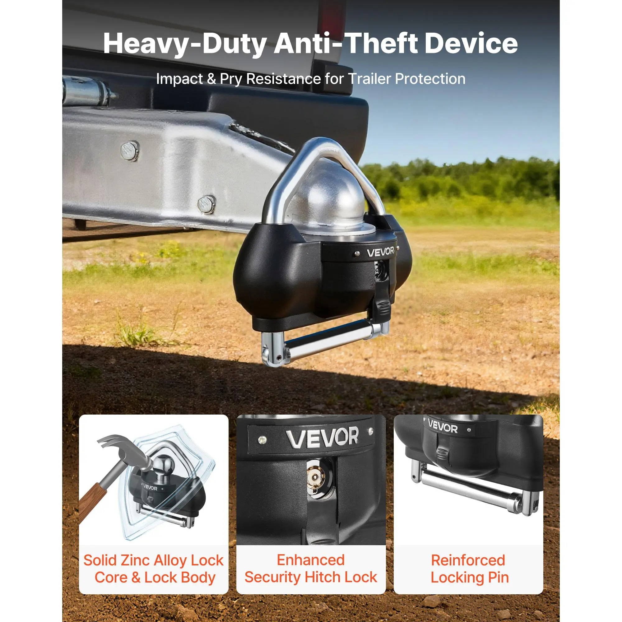 5. VEVOR Trailer Hitch Lock, Fits for 1-7/8 in, 2 in, 2-5/16 in Couplers, Heavy-Duty Anti-Theft Trailer Ball Lock with 3 Keys, Prying-Resistant, Adjustable Height Design for RVs, Boats, Trailers, Black