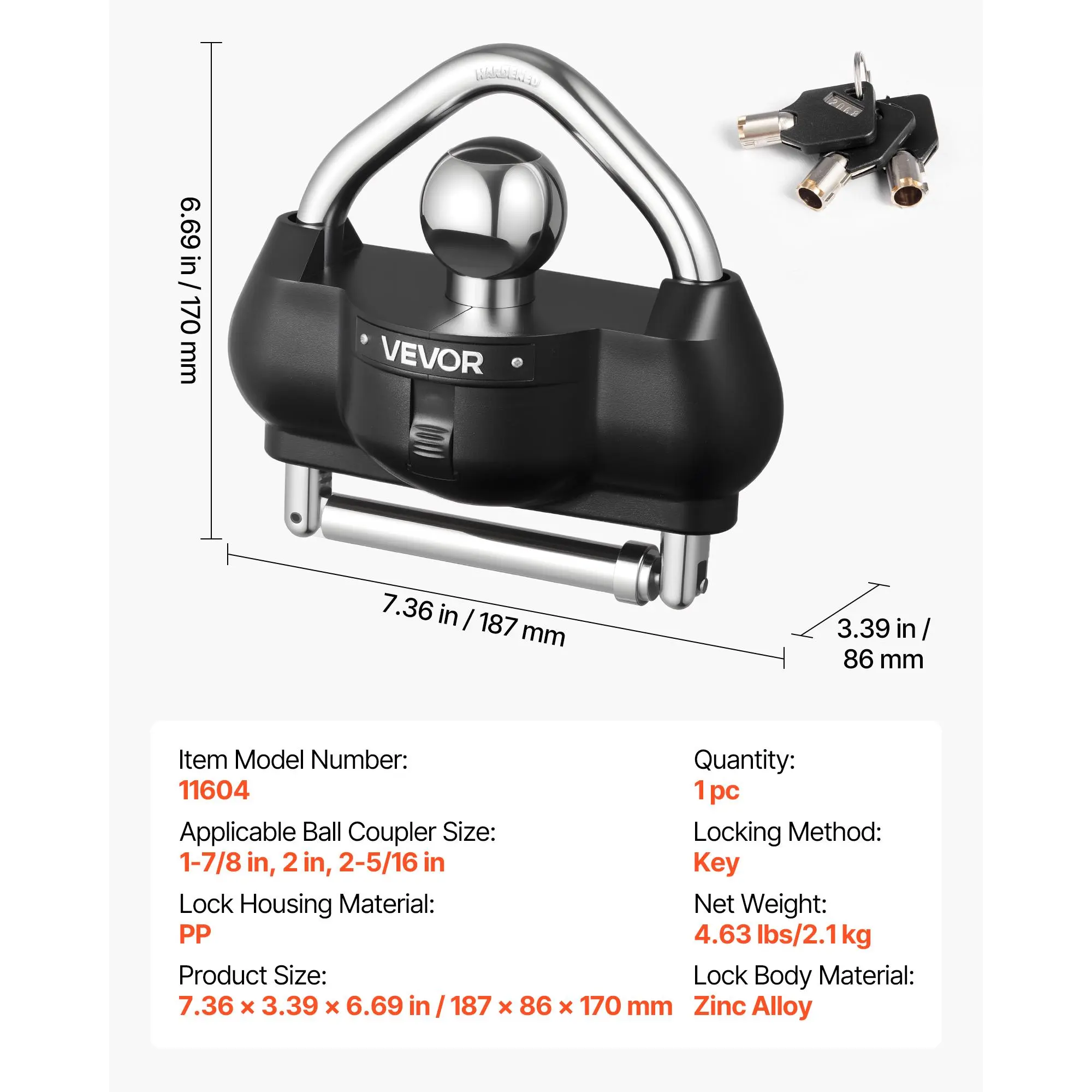 • Universal Size: This ball hitch lock features a universal fit for 1-7/8, 2 in, and 2-5/16 in couplers, meeting the needs of multiple trailers. Please confirm your coupler size before purchase to ensure the lock matches your trailer
