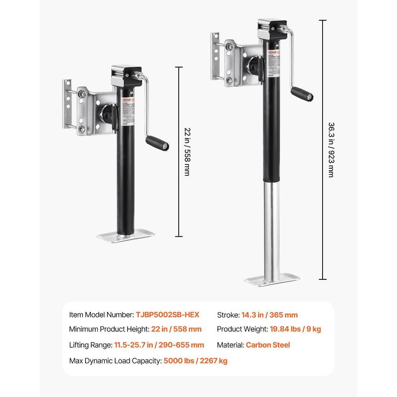 • Heavy-Duty Load Capacity: The trailer jack boasts an impressive lifting capacity of 5000 lbs, making it a powerful tool for lifting tasks. With a lifting range of 11.5 to 25.7 inches, it fits both high-profile and low-profile trailers.