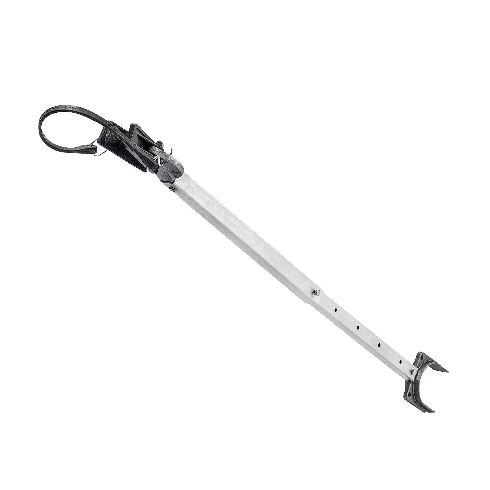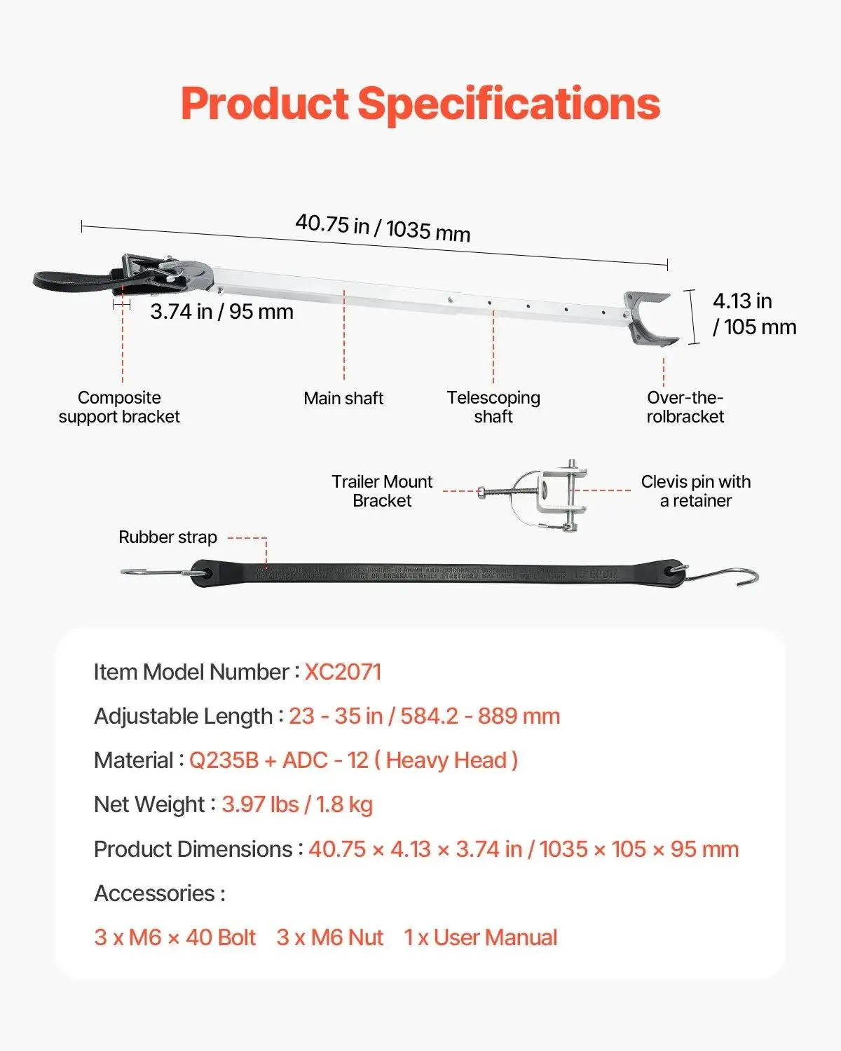 The transom saver's length can be adjusted from 23 to 35 inches. This versatility allows for a wide range of engine towing applications. Measure the distance between the engine and the trailer before use for optimal fit.