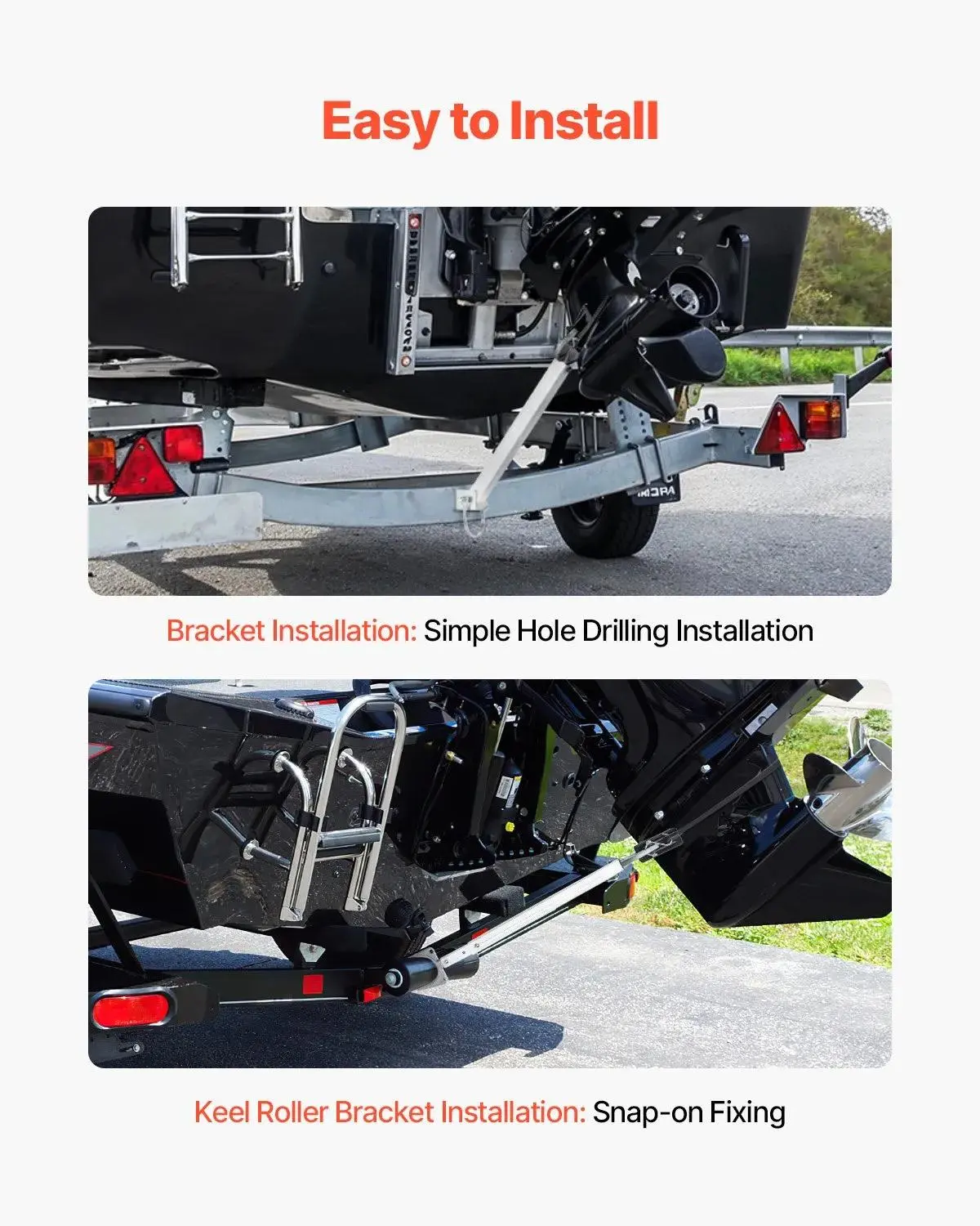 Installation is simple and can be completed by a single person. Choose between using the trailer mounting bracket or the roller bracket. The shape of the trailer rail dictates the method of assembly.