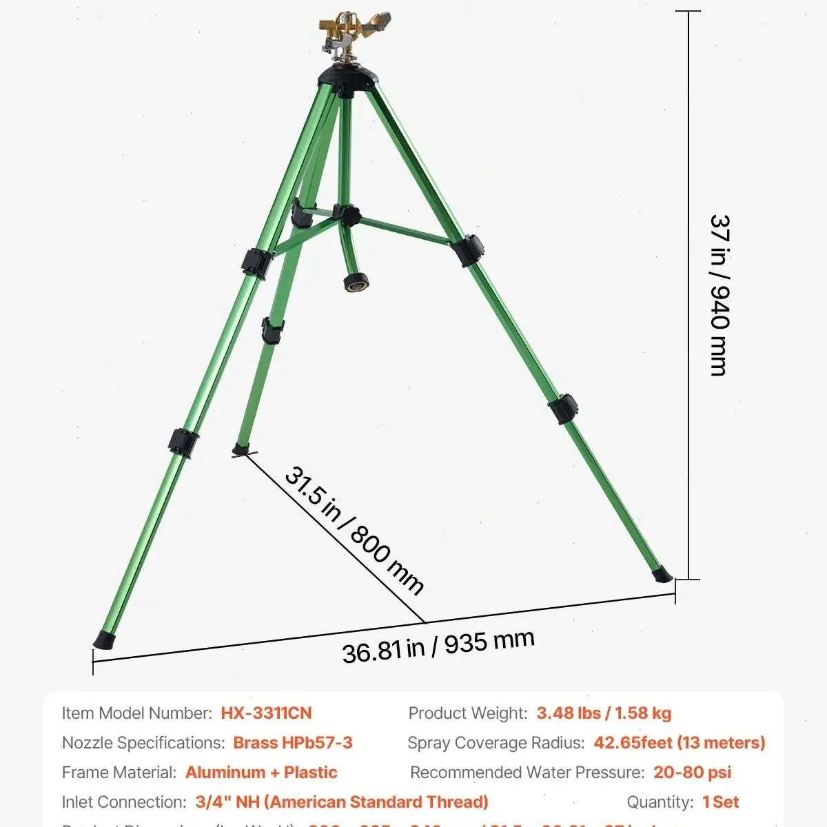 5. VEVOR Impact Sprinkler on Tripod Base, Heavy Duty Tripod Sprinklers with Brass Head & 3/4" Connector, 360 Degree Large Area Coverage Irrigation Sprinkler, Adjustable Heights Sprinkler for Yard Green