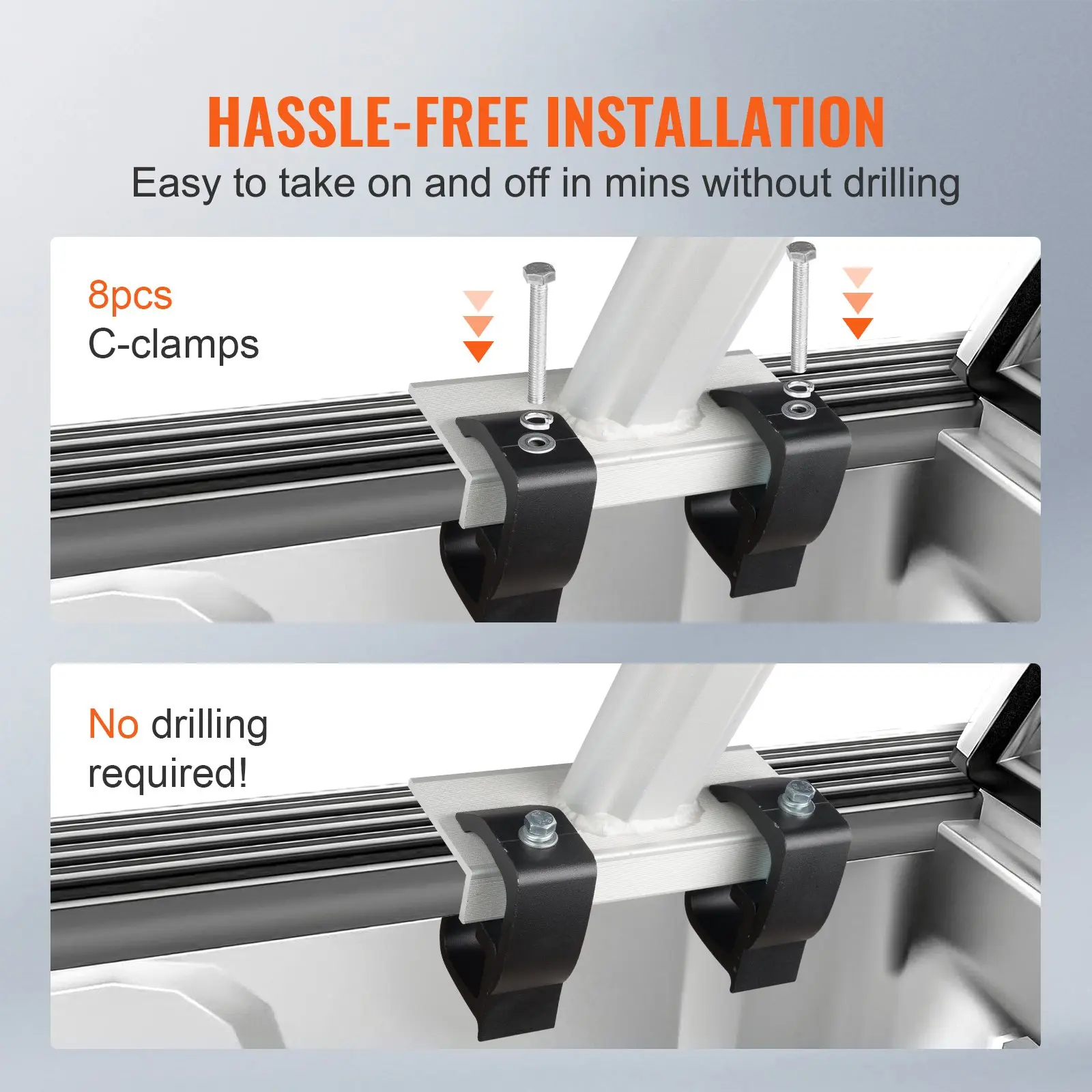 ·Start Loading in No Time: Stop to waste time in installation! Our racks for trucks feature a quick C-clamps(8 pcs) mounting system that requires no drilling. All necessary mounting accessories are also provided. The choice has never been easier. It won't cause damage to your truck side beam, and it can be removed quickly.
