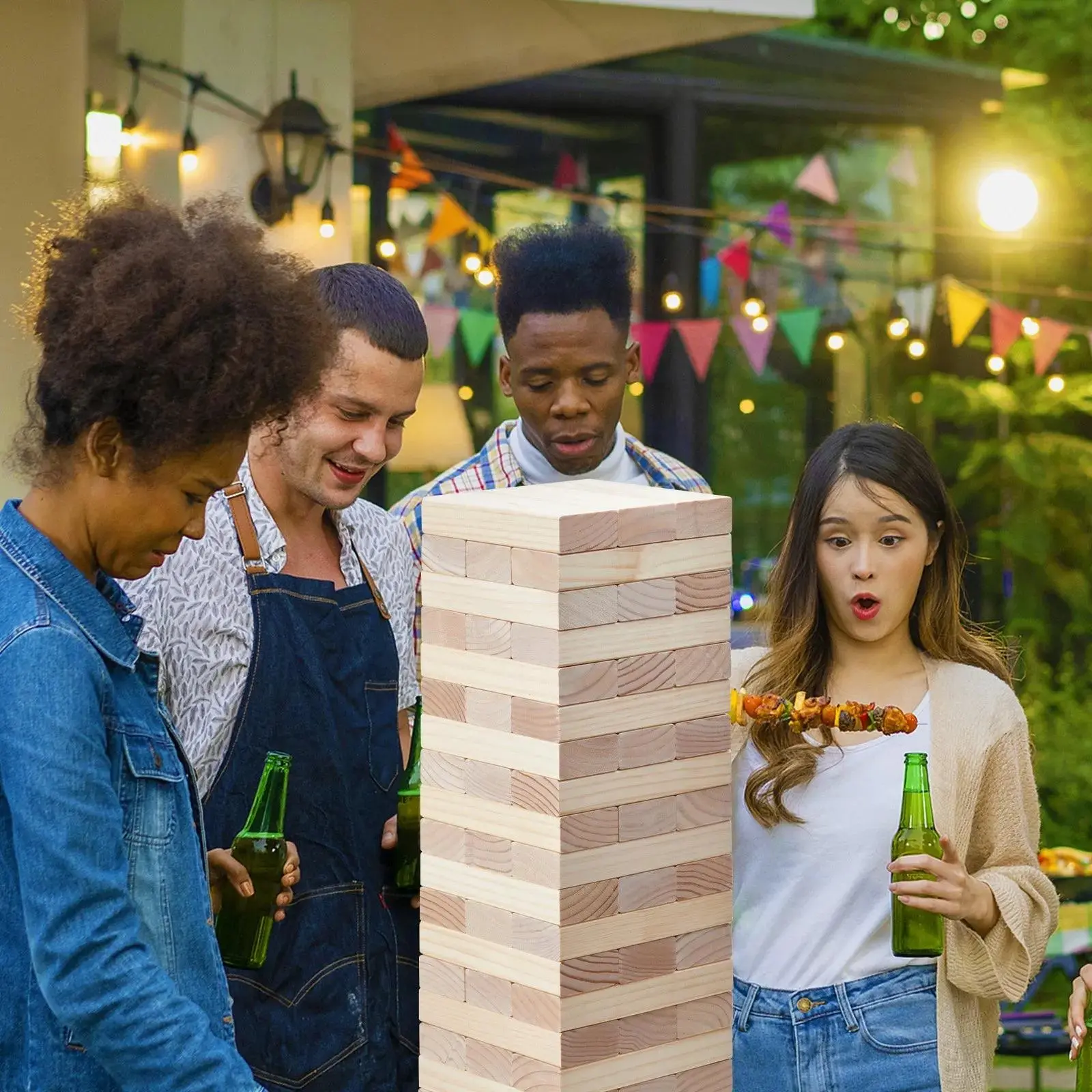 Crafted from high-quality pine wood, this tumble tower blocks game is durable. Each block is precisely cut, smooth, splinter-free, and crack-free. It's easy to remove blocks during the game. Ideal for both indoor and outdoor use, including backyards, lawns, beaches, and more!