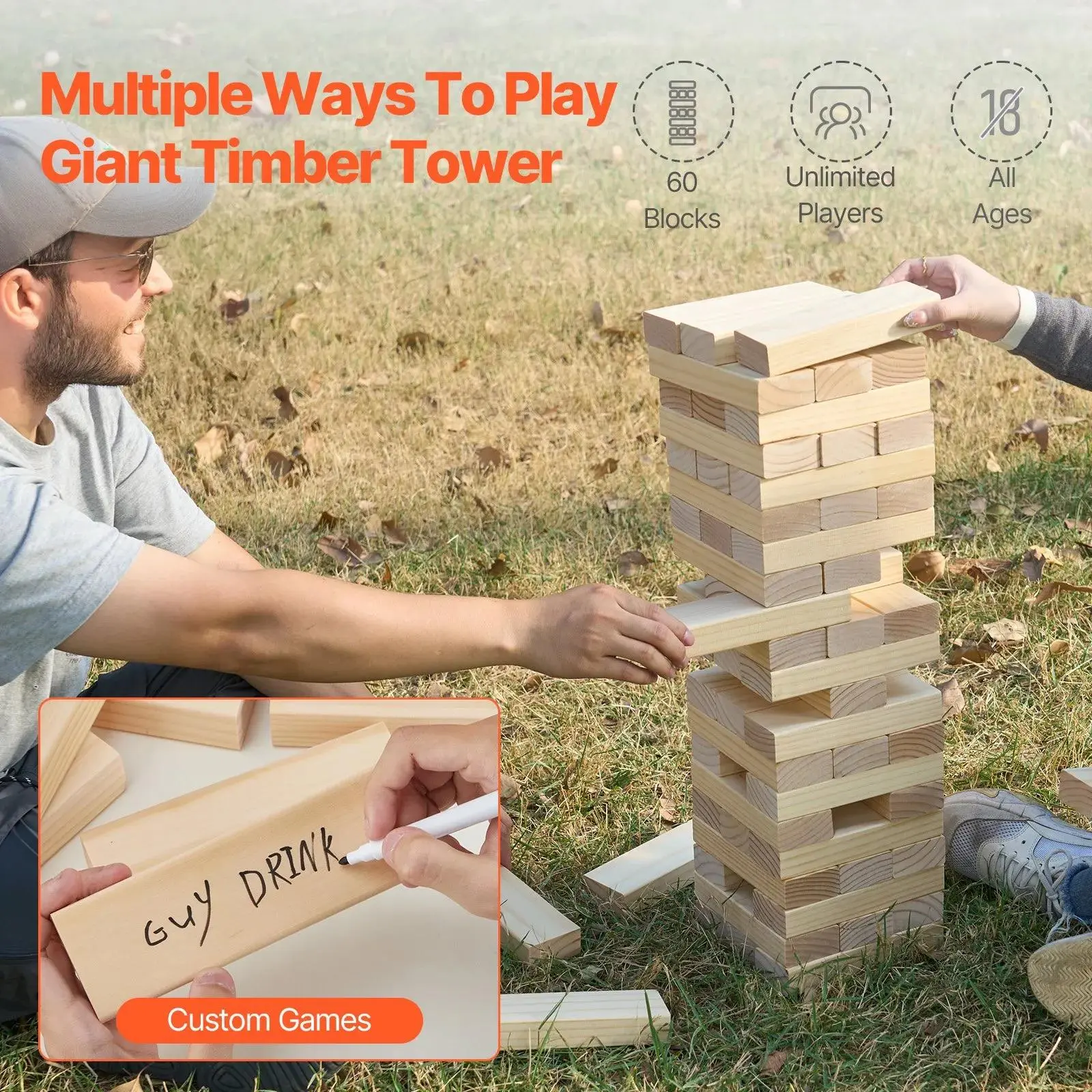 This tumble timber set includes 60 blocks, perfect for building timber towers. Customize the game by writing rules on the blank blocks or using them for doodling. The blocks measure 7.1" x 2.4" x 1.2", with an initial height of 24". The toy can reach up to 5.5 feet tall! Build your own giant wooden tower for endless fun.