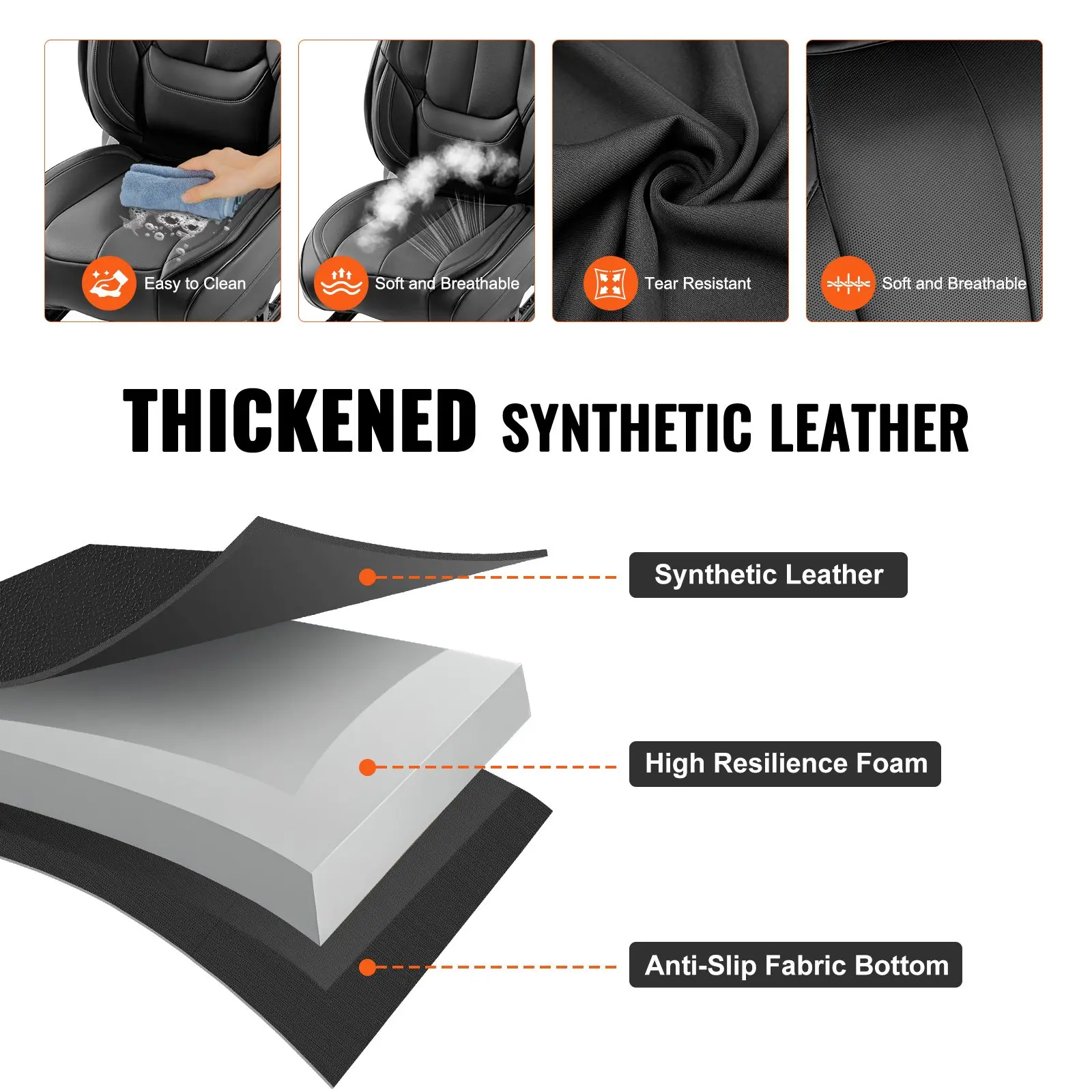 ·Thick Faux Leather: Made of three-layer thickened faux leather material, with a delicate and soft touch, breathable design suitable for all seasons. The surface is resistant to dirt and easy to clean, protecting your seats from spills, stains, pet hair, and harmful UV rays. They are fade-resistant and durable.