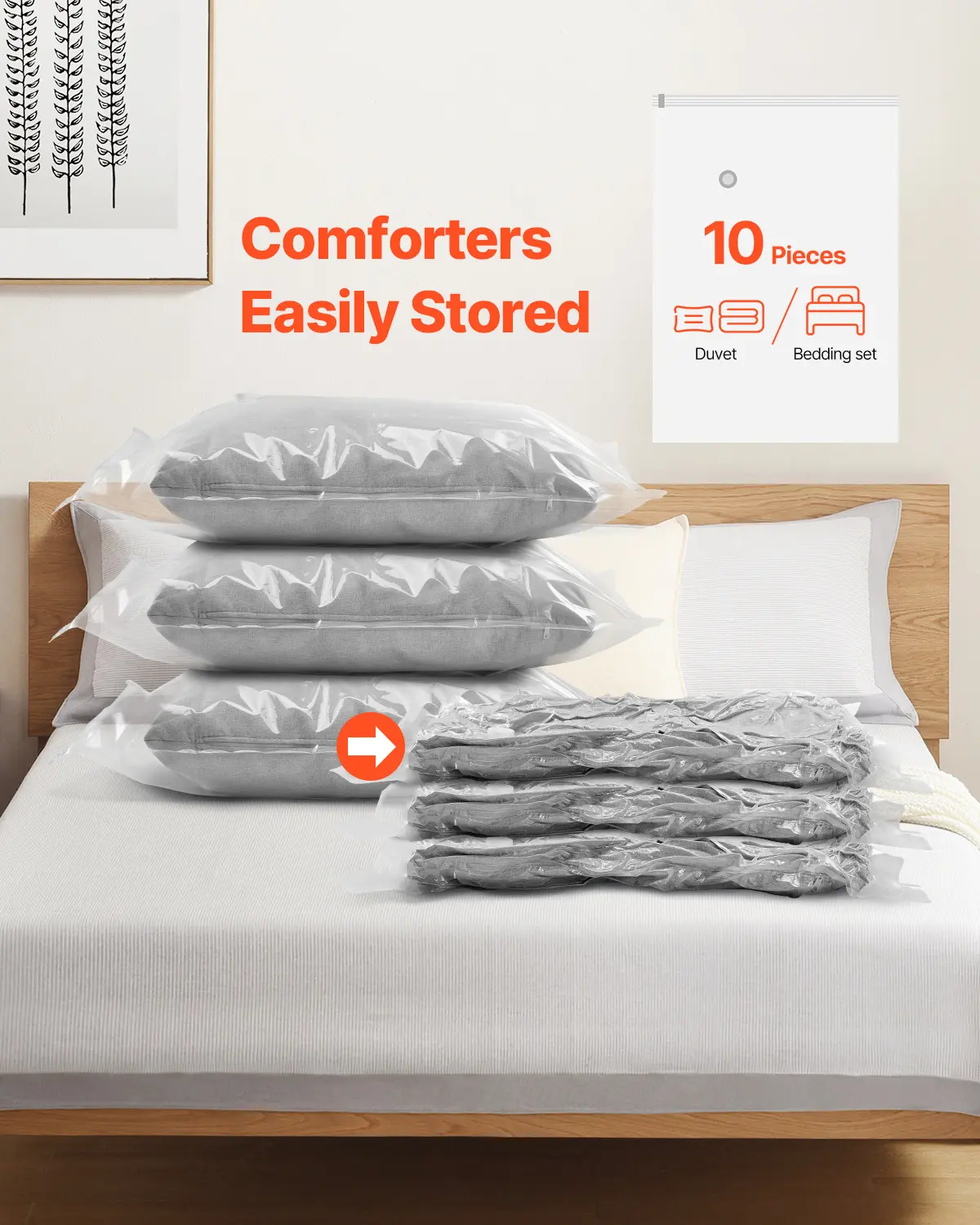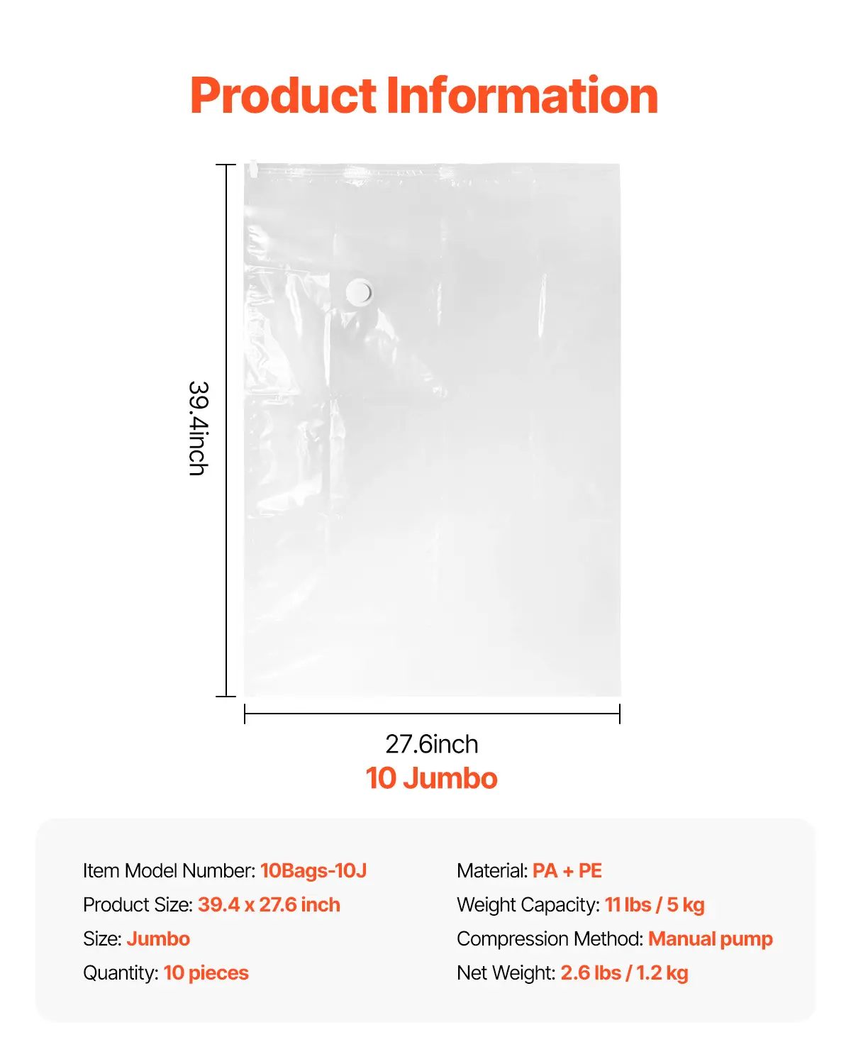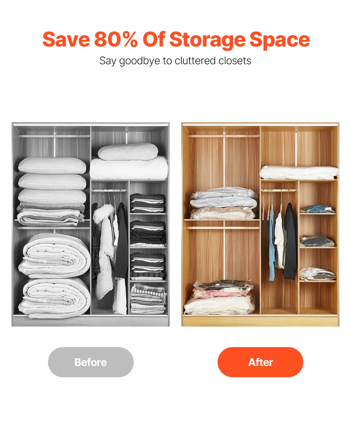 You can’t beat the price! The manual pump requires some muscle, it’s a workout. But it took my three fluffy pillows that filled a garbage bag down to storage shelf size. I am still working flattening, all in all not too bad for my first try. The bags are really large! I could have fit more…