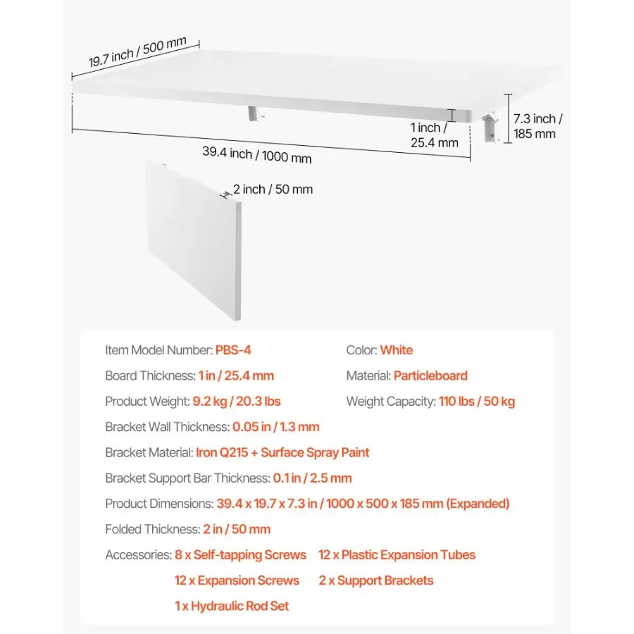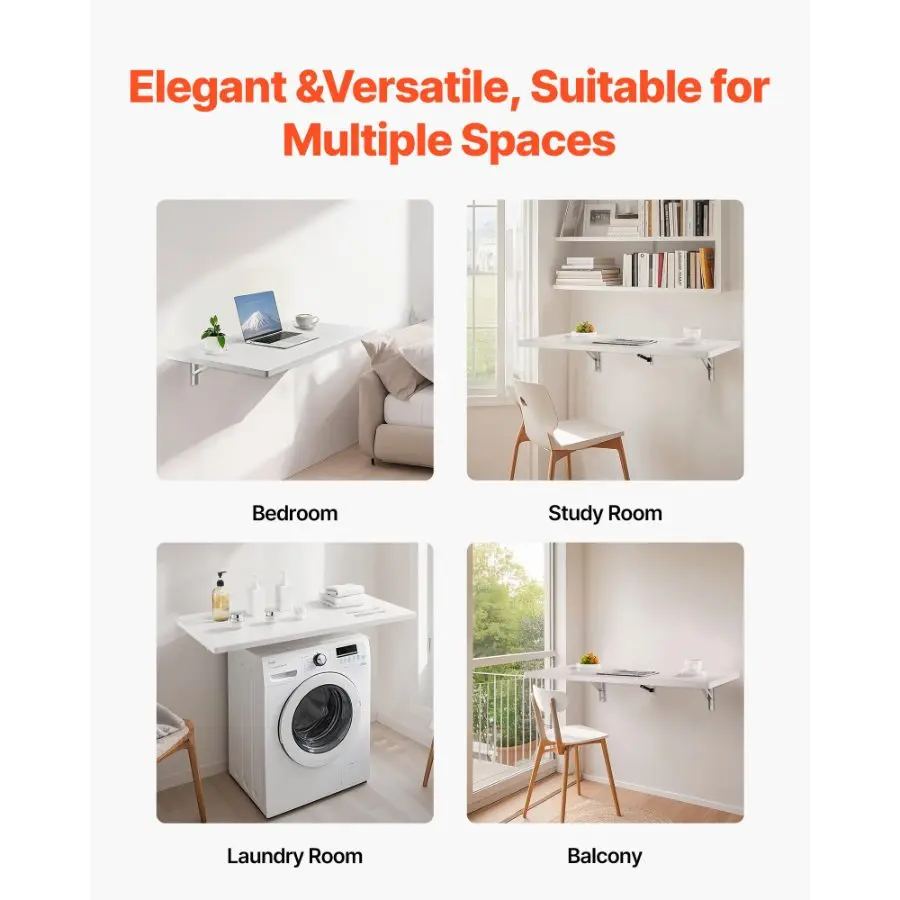 VEVOR Wall Mounted Folding Table, 39.4x 19.7 inches Wall Mount Table, Floating Desk with Iron Bracket, Fold Down Desk for Small Spaces, Home Office, Dining, Laundry Room, Kitchen, Bar, White