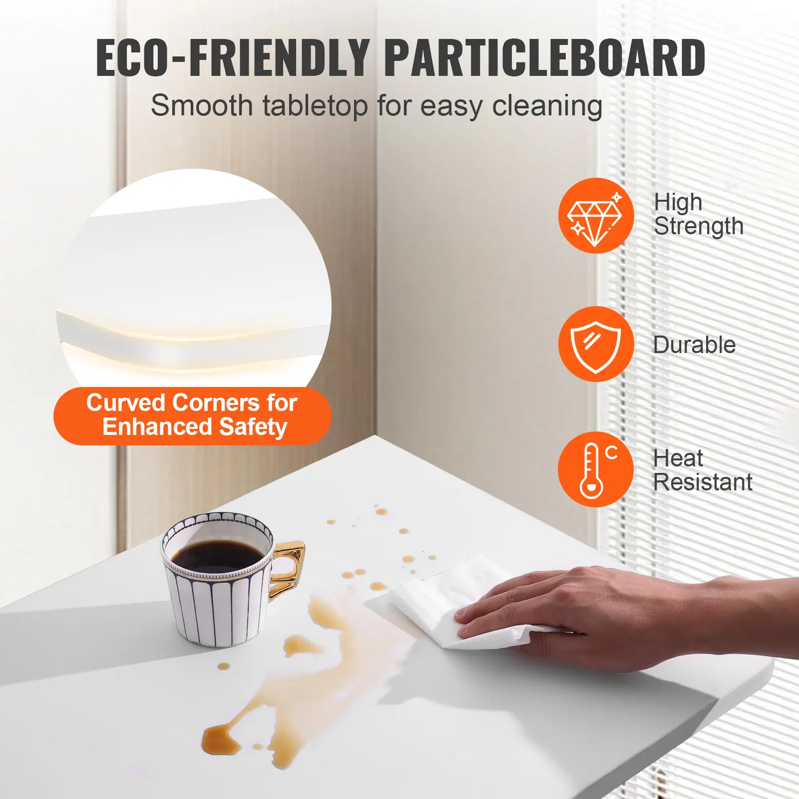 • Durable Eco-Friendly Material: Crafted from eco-friendly particleboard, this fold-down desk features a sturdy yet lightweight design.Its laminated surface resists water and oil stains, ensuring easy cleaning.The smooth, curved edges minimize impact and scratches, ensuring a safer user experience.