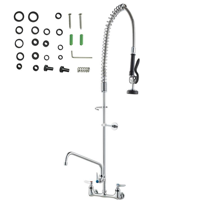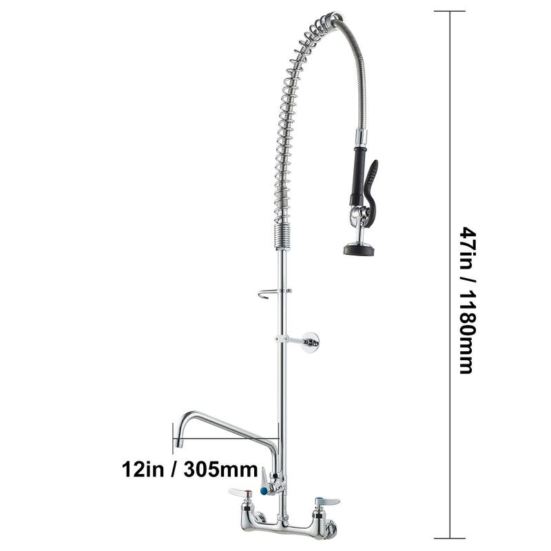 • Wall-Mounted Commercial Faucet: This 47-inch tall pre-rinse faucet is designed for wall-mount installation in kitchen walls, featuring a spray head and a 12-inch swivel faucet, easily tackling complex and tough dirt challenges. It is suitable for use with 3-compartment professional-grade commercial kitchen sinks.