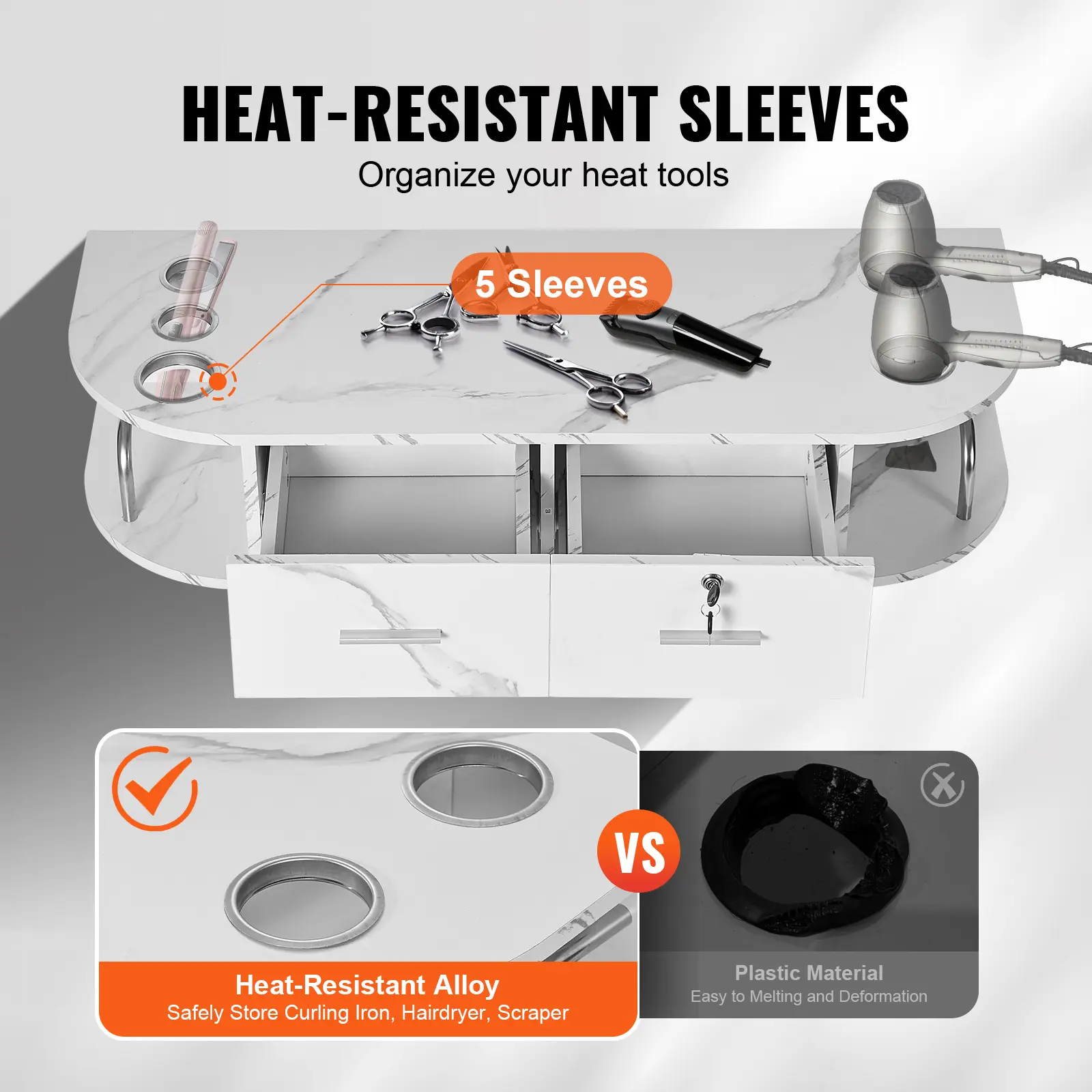 • Heat-Resistant Tool Sleeves: Made of heat-resistant alloy material, the hair styling salon station provides 5 heat tool sleeves with a bottom cover design to prevent tools from falling, ensuring safety during use.