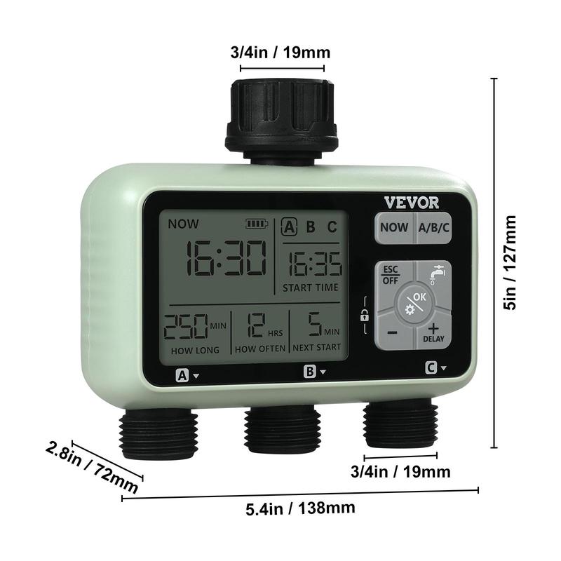 • 3 Independent Watering Zones: Our sprinkler water timer features 3 separate water outlets, each programmable using the "A/B/C" buttons. Customize watering schedules for each zone independently, ensuring no interference between them. It allows for efficient management of large-scale irrigation, saving you time and effort in garden or farm maintenance.