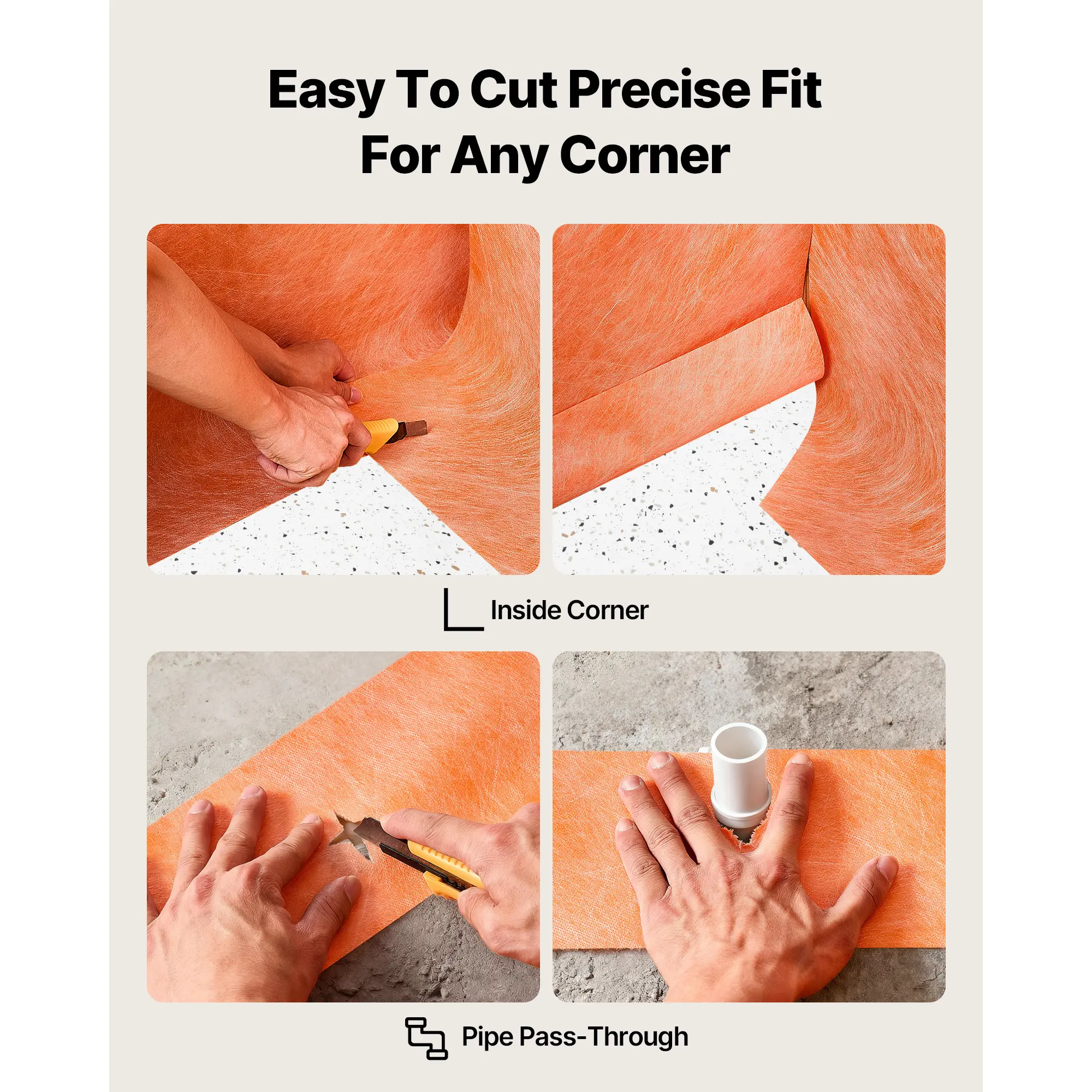 • Easy to Cut and Apply: The tile membrane can be quickly trimmed with scissors or a utility knife. Flexible enough to fit wall folds and pipe penetrations, reducing wrinkles and gaps, lowering leak risks, and enabling faster, cleaner installation