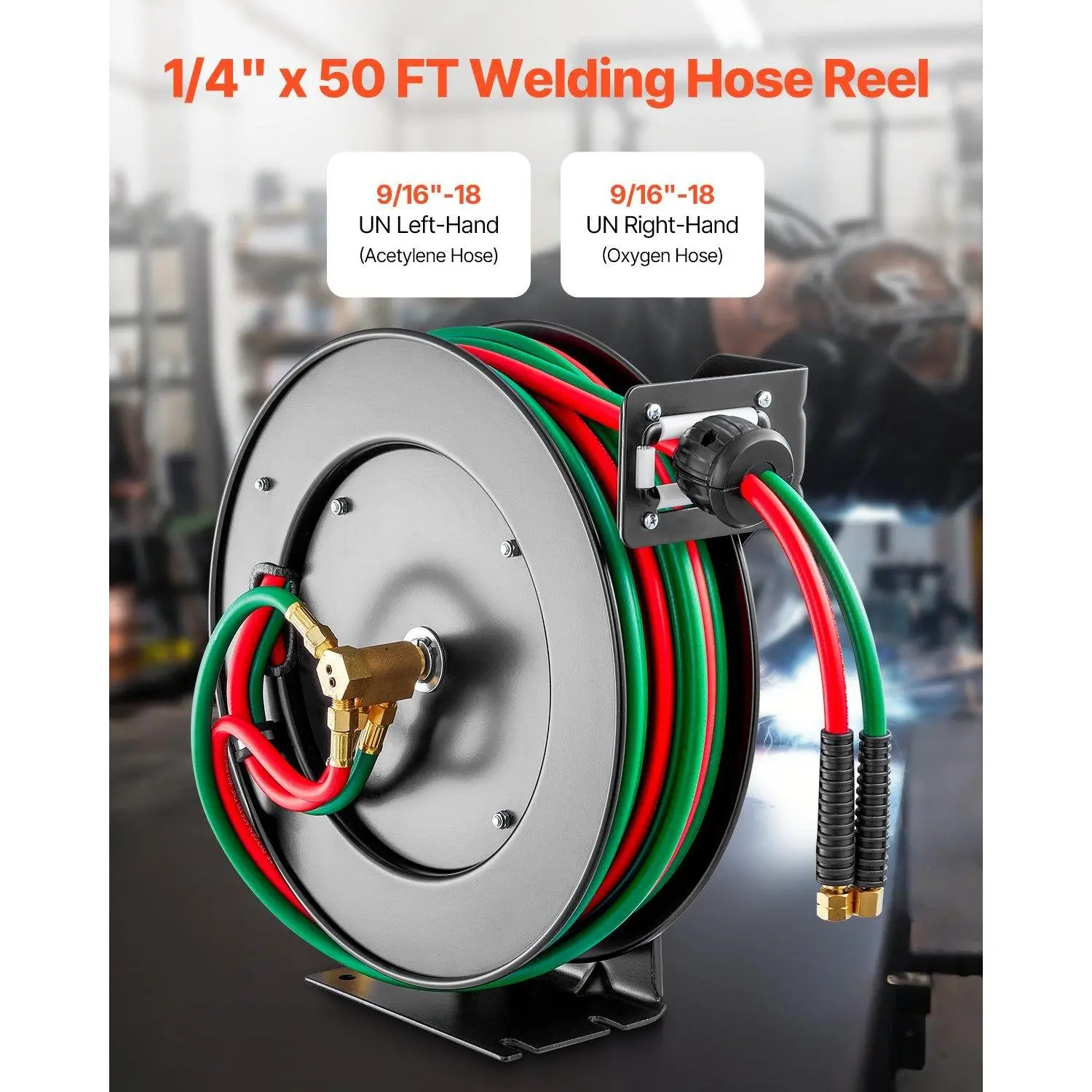 5. VEVOR Retractable Welding Hose Reel, 1/4-Inch x 50FT Twin Oxygen Acetylene Rubber Hose Max 300PSI - T/R Grade, Ceiling/Wall Mount Heavy Duty Steel Hose Reel Auto-Rewind, Ideal for Workshops Garages