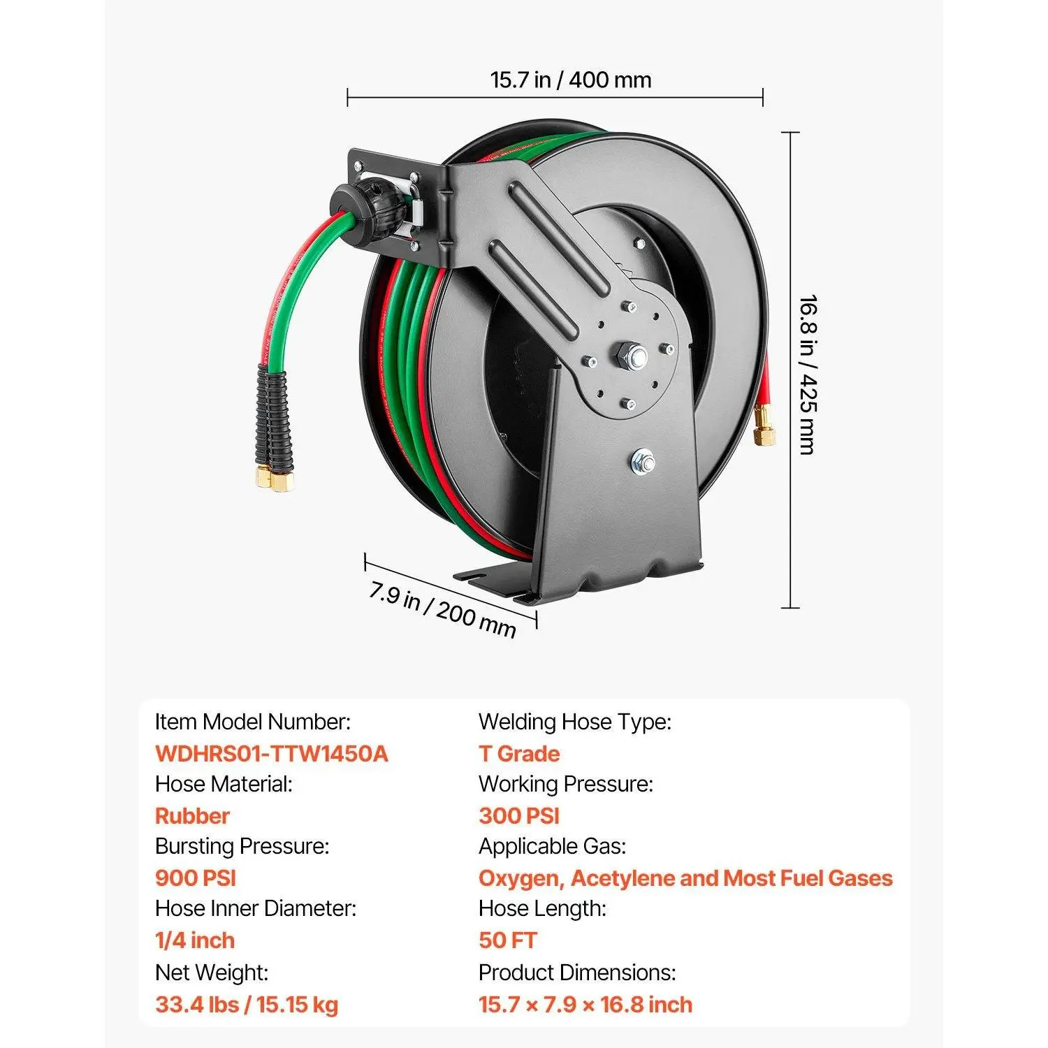 VEVOR Retractable Welding Hose Reel, 1/4-Inch x 50FT Twin Oxygen Acetylene Rubber Hose Max 300PSI - T/R Grade, Ceiling/Wall Mount Heavy Duty Steel Hose Reel Auto-Rewind, Ideal for Workshops Garages